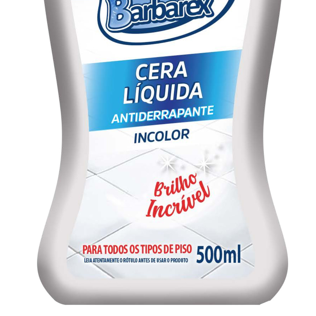 Cera Líquida Incolor Barbarex de 500 Ml A Cera Incolor Líquida Barbarex é um produto multifuncional que oferece limpeza, perfume, proteção, brilho e revitalização de cores para pisos. Especialmente formulada para diversos tipos de superfícies, como paviflex, cerâmica porosa, ardósia, assoalho com cascolac/sintético (verniz base solvente), cimento queimado e mármore. Com sua aplicação fácil e eficiente, essa cera garante uma camada protetora duradoura, realçando a beleza natural dos pisos enquanto os mantém impecáveis. Recomendações de Armazenamento: Mantenha o produto na embalagem original. Armazene em local fresco, seco, e protegido da luz direta e calor excessivo. Detalhes do Produto: Embalagem:500 Ml