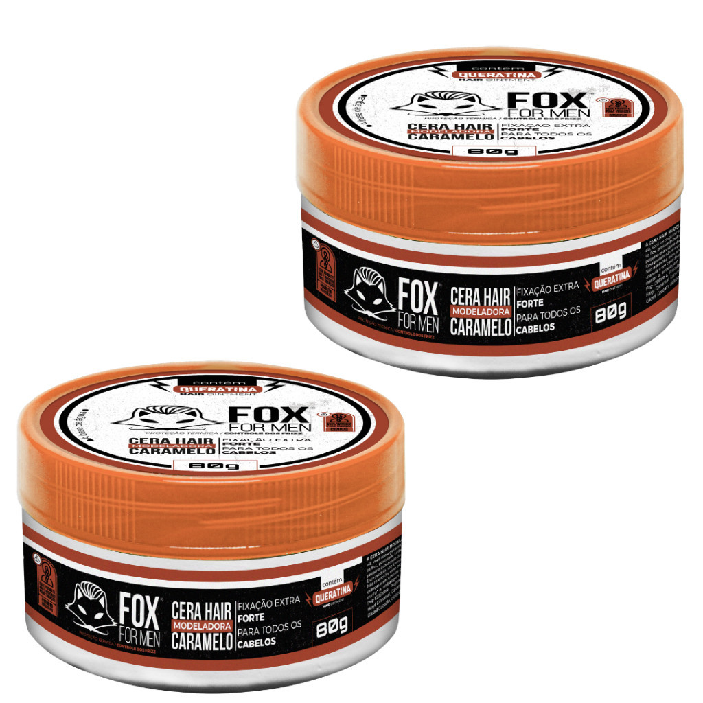 Cera Modeladora Fox For Men 80g Para Revender 15 UnidadesCera Modeladora Caramelo 80g fox for men Cera Modeladora Hair Caramelo Fox For Men 80g Apresentamos a Cera Modeladora Hair Caramelo Fox For Men 80g, uma solução definitiva para estilizar e moldar seu cabelo com facilidade e estilo. Com um irresistível aroma de caramelo, esta cera oferece uma fixação flexível de longa duração, perfeita para penteados modernos e versáteis.A textura suave e maleável da cera permite uma aplicação fácil e uniforme, garantindo controle total sobre o seu penteado. Ideal para todos os tipos de cabelo, a fórmula avançada da cera proporciona uma fixação com firmeza sem deixar resíduos indesejados, mantendo o cabelo com uma aparência natural.A Cera Modeladora Hair Caramelo Fox For Men 80g é a escolha ideal para homens que buscam um visual impecável em qualquer ocasião. Seja um penteado estruturado para o escritório ou um estilo casual para um encontro, essa cera oferece as especificações necessárias para expressar sua personalidade única.Com um pacote conveniente contendo 80g, você terá produto de qualidade premium suficiente para diversos usos. Prepare-se para impressionar com seu estilo renovado e confiante usando a Cera Modeladora Hair Caramelo Fox For Men 80g. Adquira agora e experimente o poder de um cabelo bem cuidado e estilizado ao máximo.O que é QUERATINA?A queratina é uma proteína fibrosa que constitui diversas partes do corpo humano, como os cabelos e unhas. Formada por aminoácidos, representa cerca de 90% do fio, é responsável pela integridade dos cabelos e, por isso, é usada em diversos tratamentos capilares em salões de beleza. Funciona como uma proteção e preenchimento das falhas ocasionadas por processos externos ou deficiência orgânica.Quais os benefícios do CARAMELO nos cabelos?Ele restabelece a cor, neutraliza tons alaranjados e reforça tom natural ao mesmo tempo que aumenta o brilho e a maciez do cabelo.Modo de usarPasse suavemente os dedos sobre a Cera Hair Caramelo, retirando uma pequena quantidade, espalhe na palma das mãos e aplique uniformemente no comprimento e pontas dos cabelos. Não enxágue. Faça o penteado desejado.