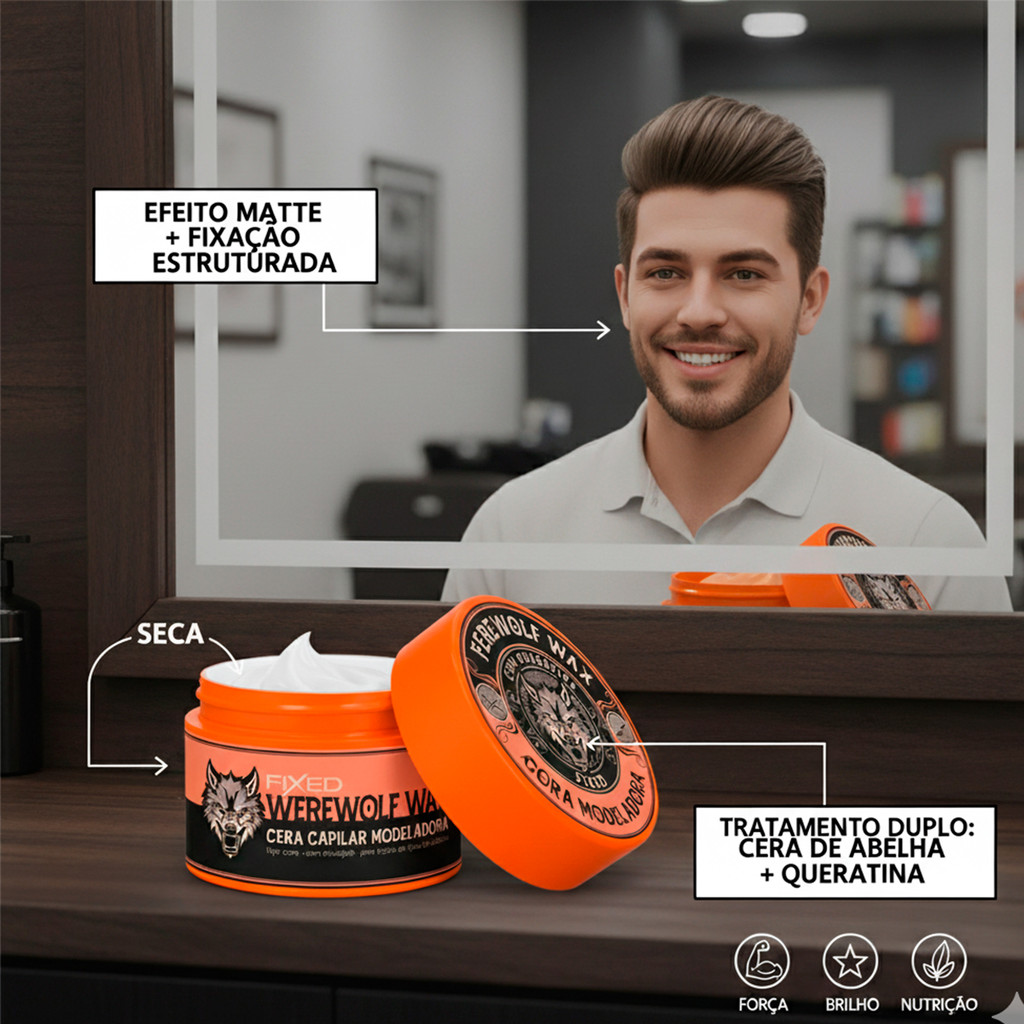 Cera Modeladora Fixed Werewolf 55g - Efeito Matte Com Queratina Cansado de ceras que deixam o cabelo oleoso ou brilhante? A Cera Modeladora Werewolf da Fixed é a sua arma secreta para um penteado impecável, com acabamento Matte (fosco) e fixação que dura. Sua fórmula única, enriquecida com Cera de Abelha e Queratina, não apenas modela, mas também trata os fios. Enquanto a Cera de Abelha oferece hidratação e um toque suave, a Queratina atua na reconstrução, dando força, nutrição e protegendo contra o frizz e a quebra. Com uma consistência mais seca, ela é perfeita para quem busca um visual estruturado, sendo a escolha ideal para topetes e moicanos que precisam ficar no lugar o dia todo. ✨ Destaques do Produto: Acabamento Matte: Efeito fosco e natural, sem brilho artificial ou aspecto oleoso. Fixação Estruturada: Consistência seca, ideal para modelar e definir penteados que exigem mais suporte, como topetes e moicanos. Tratamento Duplo: Fórmula potente que combina dois super ingredientes: Queratina: Reconstrói a fibra capilar, trazendo força, brilho e nutrição. Protege contra o frizz e o ressecamento. Cera de Abelha: Hidrata intensamente o couro cabeludo, estimula o crescimento e alisa os fios sem agredi-los. Resultado Final: Cabelos perfeitamente modelados, com aparência saudável, forte e nutrida. 📋 Modo de Usar Pegue uma pequena quantidade do produto com a ponta dos dedos. Esfregue bem nas palmas das mãos para aquecer e "ativar" a cera. Aplique nos cabelos secos ou levemente úmidos, espalhando uniformemente. Modele como desejar. O produto não precisa de enxágue. Atenção: Por ser uma cera de alta consistência, comece com pouco produto. O uso em excesso pode deixar resíduos. É sempre mais fácil adicionar mais, se necessário. 📦 Ficha Técnica Marca: Fixed Linha: Werewolf Tipo: Cera Capilar Modeladora Acabamento: Matte (Fosco) Conteúdo: 55g Principais Ativos: Queratina e Cera de Abelha