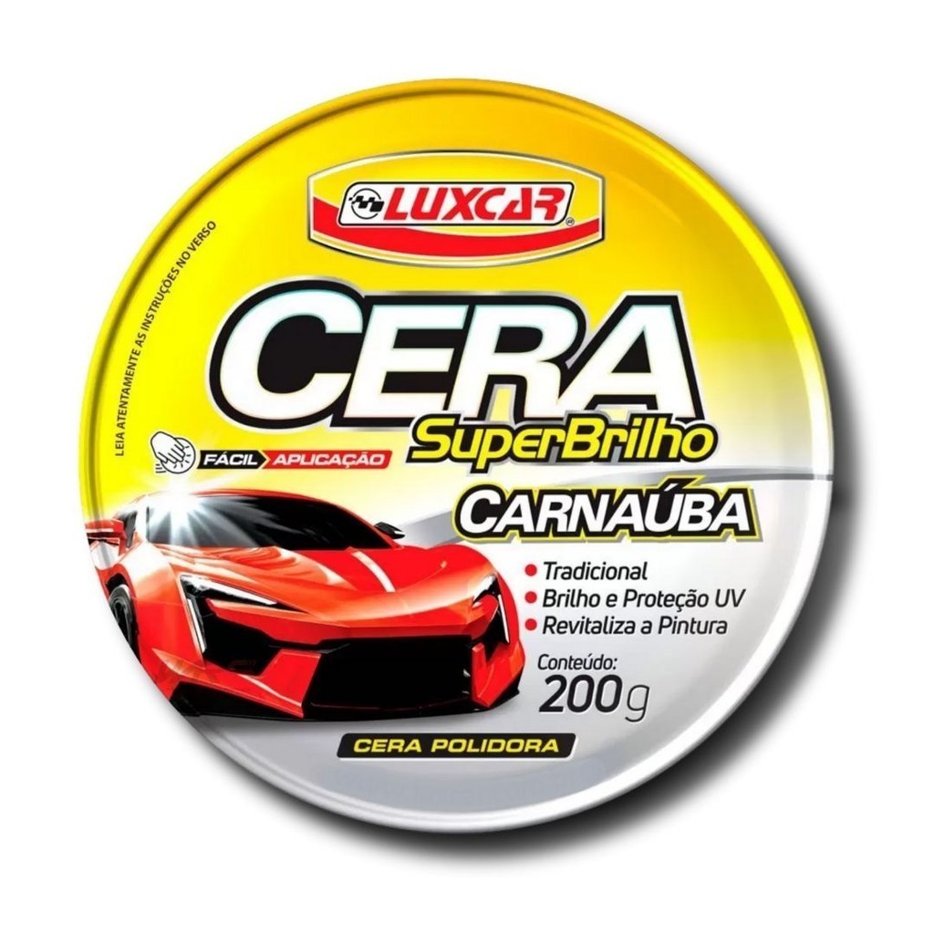 Cera Automotiva Carnaúba Luxcar Pasta SuperBrilho 200g A Cera de Carnaúba em Pasta Automotiva SuperBrilho Luxcar é desenvolvida especialmente para limpar, dar proteção e brilho prolongado a todos os tipos de pintura. Sua aplicação cria uma camada protetora na superfície que revitaliza e protege a pintura contra os raios solares por mais tempo. Pode ser aplicada ao sol ou a sombra. Seu uso é indicado para automóveis, motos, lanchas, geladeira, etc.. É uma Cera Automotiva Carnaúba de fácil aplicação! DADOS DO PRODUTO - Marca: Luxcar - Cód. Interno: 006431 - Cód. Fábrica: 4267 - Quantidade: 200g - Aplicação: Todos os tipos de pintura - Formato: Pasta - Quantidade: 200g - Emblagaem: Lata - Com proteção UV: Sim - Cores recomendadas: Todas as cores VANTAGENS - Carnaúba concentrada. - Brilho e proteção UV. - Revitaliza a pintura. - Forma película protetora. ITENS INCLUSOS - 1 Cera Automotiva Carnaúba SuperBrilho Luxcar 200g. - 1 Pano de Microfibra 35x30. MODO DE USAR 1 - Com o carro limpo e seco, aplicar o produto em pouca quantidade com estopa, algodão ou politriz elétrica. 2 - Espalhe em movimentos circulares sobre a superfície. 3 - Deixar secar por alguns minutos. 4 - Dar brilho com pano ou estopa limpa, virando-o frequentemente até surgir o brilho. IMPORTANTE - Validade 24 meses. - Valor correspondente a unidade. - Imagens produzidas através de fotos reais do produto. - Leia atentamente as instruções antes de utilizar.