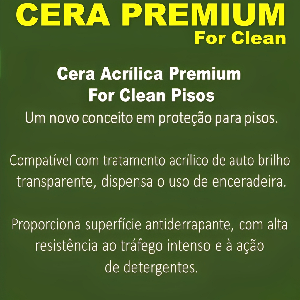 CERA ACRÍLICA PREMIUM AUTO BRILHO Proteja e deixe seu piso fosco com brilho de novo em minutos! Benefícios que você vai amar: • Brilho metalizado intenso (auto brilho – sem precisar enceradeira) • Filme impermeabilizante – protege contra manchas, riscos e umidade • Antiderrapante – mais segurança para casa, empresa e condomínio • Incolor – não altera a cor original do piso • Alta durabilidade – efeito dura dias mesmo com tráfego intenso • Fácil aplicação e secagem rápida (10-20 min) • Rende muito: ≈ 40-60 m² por litro (dependendo do piso) Ideal para: Madeira / tacos, tábua corrida, Cerâmica / Porcelanato sem brilho Piso vinílico / Paviflex, laminados Ardósia / granilite / Marmorite /cimento queimado Granito /mármore polido sem brilho (testar em área pequena) E outros pisos/superfícies Ambientes residenciais, comerciais, escritórios, clínicas e lojas Modo de usar (simples e rápido): Limpe bem o piso (pode usar detergente neutro) Deixe secar completamente Aplique com rodo aplicador de cera de espuma, mop ou pano limpo em camada fina e uniforme Aguarde secar → brilho aparece sozinho! Produto Premium com qualidade profissional – resultado parecido com piso de shopping e hospital. Compre agora e transforme seu piso hoje mesmo! Frete rápido + embalagem segura.