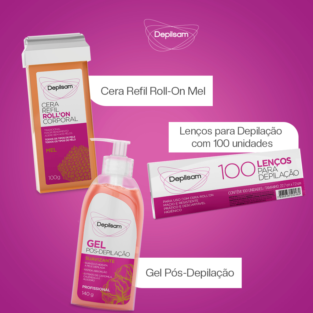 A Cera Refil Roll-On Corporal Depilsam Mel 100G foi desenvolvida para garantir uma depilação eficiente, prática e menos dolorosa. Sua fórmula com extrato de mel ajuda a hidratar e suavizar a pele, reduzindo a irritação e proporcionando um toque macio após a remoção dos pelos. Indicada para todos os tipos de pele, essa cera adere bem aos fios, removendo-os desde a raiz e garantindo um resultado duradouro. Perfeita para uso com aquecedores elétricos roll-on, é a solução ideal para uma depilação profissional no conforto da sua casa! ❌ O Produto não acompanha lenços. ❌ Esse produto não é indicado para região íntima. Benefícios: ✅ Remove até os pelos mais curtos com precisão ✅ Adesão perfeita aos fios para uma depilação eficaz ✅ Textura suave e fácil de aplicar ✅ Maior rendimento e menos desperdício ✅ Indicado para pernas, braços e outras áreas do corpo ✅Facilidade na aplicação: O sistema roll-on garante uma distribuição uniforme da cera. ✅Maior rendimento: Adere bem aos pelos, garantindo uma depilação completa sem desperdícios. ✅Resultado profissional: Pele macia e lisa por mais tempo. ✅Suavidade e eficiência: Remove até os pelos mais finos com delicadeza. Modo de Uso: 1️⃣ Aqueça a cera no aparelho elétrico por cerca de 30 minutos. 2️⃣ Aplique na pele limpa e seca, no sentido do crescimento dos pelos. 3️⃣ Coloque o lenço de depilação sobre a cera, pressione e puxe rapidamente no sentido contrário ao crescimento dos pelos. 4️⃣ Finalize com o removedor e gel pós depilação para acalmar a pele. COMPOSIÇÃO: Colophonium,Ricinus Communis Seed Oil,Parfum,Bht,Mel Extract