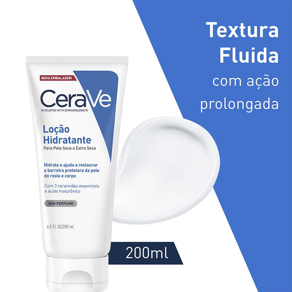 Desenvolvido com dermatologistas, a loção hidratante de CeraVe possui textura fluida de rápida absorção, além de hidratar e ajudar na restauração da barreira protetora da pele.A Loção Hidratante para o corpo e rosto de CeraVe ajuda a hidratar a pele e restaurar sua barreira protetora natural, além de ser leve e livre de óleos.Sua fórmula contém 3 ceramidas essenciais e ácido hialurônico que proporcionam alta hidratação e restauração da barreira da pele. A Loção Hidratante de CeraVe é não comedogênica e não obstrui os poros, além de possuir textura fluida de rápida absorção. Apresenta a patenteada Tecnologia MVE para liberação contínua de ingredientes, garantindo uma hidratação por 24 horas.- Textura Fluida - Ajuda a restaurar e manter a proteção da barreira natural da pele.- Liberação prolongada de ativos para uma hidratação que dura o dia todo.- Ajuda a reter a hidratação natural da pele.- Suave na pele: Fórmula de rápida absorção.- Não obstrui os poros.- Sem perfume.*Produto foi desenvolvido com base em informações e necessidades indicadas por dermatologistas. * PRECAUÇÕES: Manter fora do alcance de crianças. * MODO DE USO: 1 - Aplique uma quantidade generosa da Loção Hidratante CeraVe nas mãos2 - Massageie a parte desejada do corpo3 - Aproveite a profunda hidratação da sua pele * RESULTADO: Pele saudável * ITENS INCLUSOS: 1 Cerave Locao hidratante Corporal 200ml.