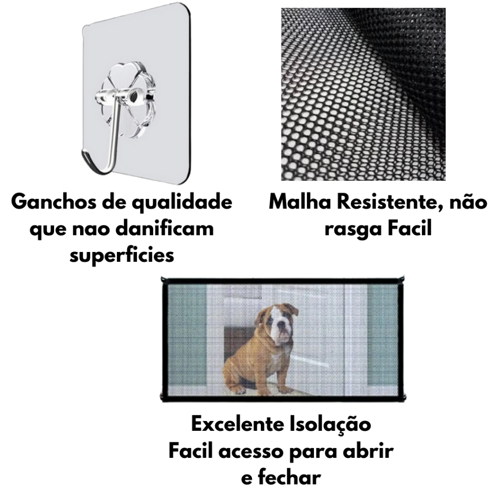 *ATENÇÃO: Este anuncio inclui 1 tela de proteção + 4 ganchos adesivos. NÃO INCLUI BASE DE FERRO, PLÁSTICO, SUPORTE OU QUALQUER OUTRO TIPO DE ESTRUTURA. O Cercado de malha é a solução ideal para manter seu pet seguro e protegido dentro de casa. Com altura de 75 cm, ele ajuda a restringir o acesso a determinadas áreas, proporcionando mais tranquilidade e segurança no dia a dia. Tamanhos disponíveis (largura) : • 40 cm • 60 cm • 80 cm • 95 cm • 115 cm • 135 cm • 155 cm Altura padrão: 75 cm - NÃO RECOMENDADO INSTALAR OS GANCHOS ADESIVOS EM PAREDES COM REBOCO, CIMENTO, TEXTURA E SUPERFÍCIES POROSAS. - Aguardar no mínimo 1h antes de colocar a cerca no gancho para uso, isso ajudar a fixar a cola. - Não recomendado para animais de grande porte. - Não utilizar como tela de proteção em janelas