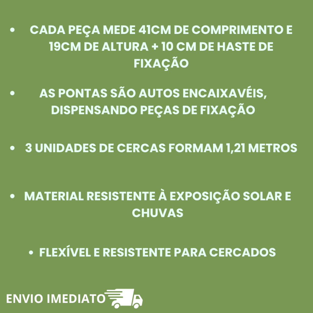 Kit com 12 cercas decorativas estilo inglês, totalizando 4,98 metros lineares. Material PP resistente, ideal para jardins, vasos e canteiros. Fácil encaixe, alta durabilidade e envio imediato. 📦 DESCRIÇÃO COMPLETA 🌿 Cerca Decorativa para Jardim – Modelo Inglês Transforme o visual do seu jardim com elegância e praticidade! O kit com 12 unidades oferece 4,98 metros lineares de decoração e proteção para plantas, vasos, canteiros e hortas. ⭐ DETALHES DO PRODUTO ✔ Modelo: Cerca Decorativa Estilo Inglês ✔ Material: PP (Polipropileno) ✔ Super resistente a sol, chuva e intempéries ✔ Montagem simples – encaixe rápido ✔ Perfeita para jardins, hortas e paisagismo ✔ Kit com 12 peças ✔ Total linear: 4,98 metros 📏 MEDIDAS DE CADA PEÇA Comprimento: 41,5 cm Altura da cerca: 19 cm Haste de fixação: +10 cm Altura total para fixar no solo: 29 cm 🛒 INFORMAÇÕES IMPORTANTES ✔ Envio rápido e bem embalado ✔ Produto novo, pronta entrega ✔ Garantia contra defeito de fabricação cerca jardim cerca decorativa cerca inglesa cerca jardim plástico cerca para plantas cerca para canteiro cerca paisagismo muro jardim decorativo grade decorativa jardim cerca hortinha