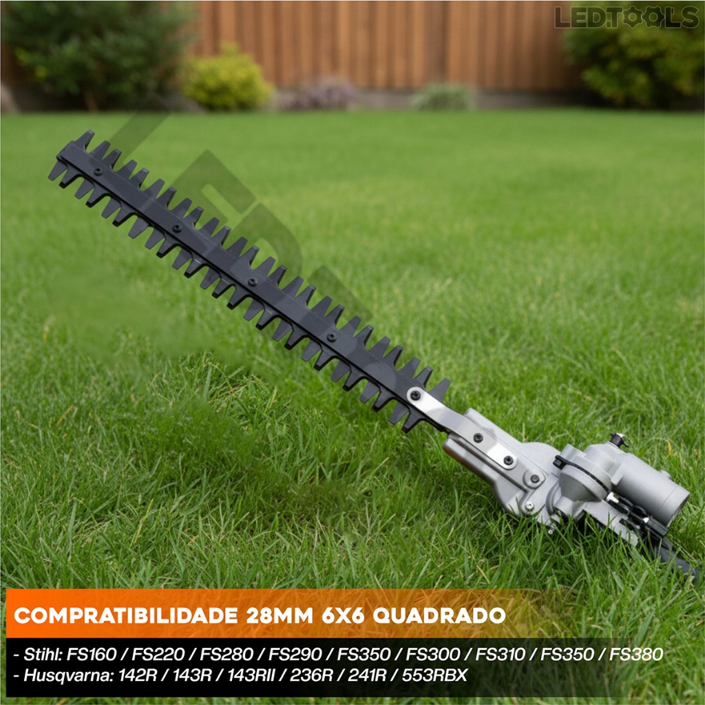 Aparador Podador de Cerca Viva para Roçadeiras 28mm 6x6 Quadrado ---------------------------------------------------------------------------------------------------------------------------------------------------------------------- Transforme sua roçadeira em um aparador de cerca viva com facilidade usando o Mecanismo Cerca-Viva. Este aparador é ideal para podar cercas vivas em muros, permitindo o uso em posições horizontal, vertical e 90° acima da cabeça, sem encostar na parede. A montagem e manuseio do acessório são simples e intuitivos, proporcionando resultados de qualidade com menor esforço e tempo. Compatível com roçadeiras e multifuncionais de todas as cilindradas que possuam tubo com diâmetro de 28mm e cardã 6x6 Quadrado. * OBS: Antes de utilizar, verifique o diâmetro do tubo da sua roçadeira e a quantidade de estrias, para garantir que este podador seja compatível apenas com roçadeiras que tenham tubo de 28mm 6x6 Quadrado * NÃO ACOMPANHA TUBO E NEM ROÇADEIRA. Características: • Versátil e prático, ideal para poda de cercas vivas em muros. • Pode ser usado horizontalmente, verticalmente e até a 90° acima da cabeça. • Montagem e uso simplificados. • Agilidade e eficiência para um resultado impecável em menos tempo. • Exclusivamente para roçadeiras com junção compatível. • Transforme sua roçadeira em um aparador de cerca viva. • Perfeito para manutenção de jardins com vegetação vertical e modelagem de cercas vivas. Modelo profissional robusto, com sistema de lubrificação fácil, lâminas de alto poder de corte e capina, ideal para pequenas e médias hortas e plantações em seu cultivo e preparação do solo. PESO 3,9 KILOS Marcas Compatíveis: - Stihl: FS160 / FS220 / FS280 / FS290 / FS350 / FS300 / FS310 / FS350 / FS380 - Husqvarna: 142R / 143R / 143RII / 236R / 241R / 553RBX ---------------------------------------------------------------------------------------------------------------------------------------------------------------------- * Garantia do Vendedor: 3 Meses * Estamos à disposição para esclarecer suas dúvidas, utilize o campo de perguntas! Obrigado por sua compra; estamos comprometidos a garantir que você esteja satisfeito. Equipe Led Tools