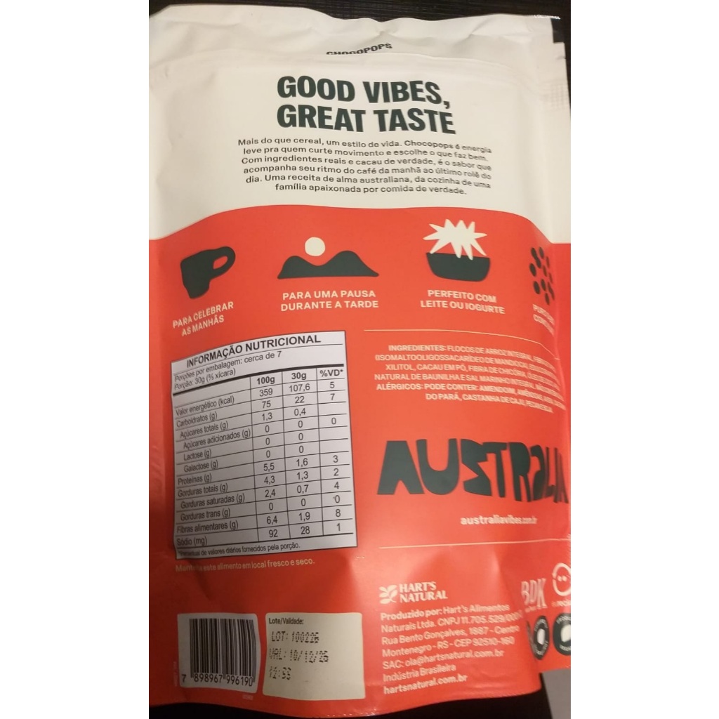 CEREAL CHOCOPOPS HARTS 200g Ingredientes Flocos de arroz integral, fibra de tapioca, edulcorante natural xilitol, cacau em pó, fibra de chicória, óleo de coco, aroma natural de baunilha e Enbsp;sal marinho integral. Restrição alimentar NÃO CONTÉM GLÚTEN. ALÉRGICOS: PODE CONTER: AMENDOIM, AMÊNDOAS, AVEIA, CASTANHA DO PARÁ, CASTANHA DE CAJU, PECÃ E SOJA.