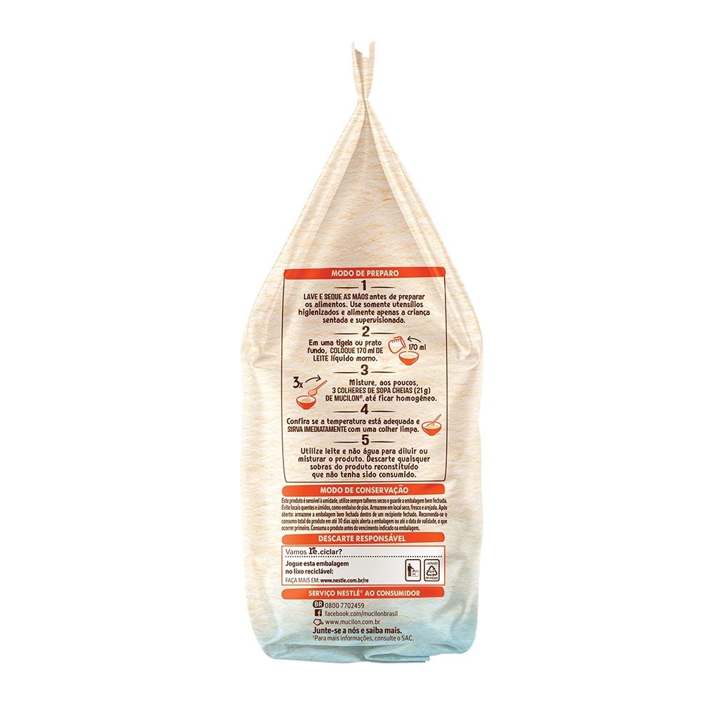 Características principais do produto: Marca:Nestlé Modelo:Mucilon Segmento:Cereal Infantil Sabor: Arroz Informações Adicionais do Produto: Rico em nutrientes que contribuem para a Imunidade e Desenvolvimento Cerebral. Proporciona uma alimentação equilibrada. Rico em Vitamina A, C, D, E, B6, B9, ferro e zinco. 13 Vitaminas e Minerais. Vitaminas A, C, D, E, B6, B9 (ácido fólico), ferro e zinco.O Ferro e o Zinco ajudam nos processos responsáveis pelo desenvolvimento adequado do cérebro. Modo de Preparo: 1.Lave as mãos antes de preparar os alimentos do seu filho. Use somente utensílios higienizados. 2.Em uma tigela ou prato fundo, coloque 170 ml de leite líquido morno. 3.Misture, aos poucos, 3 colheres de sopa cheias (21g) de Mucilon® de Arroz até ficar homogêneo. 4.Sirva imediatamente com uma colher limpa. Alergênicos: Contém derivados de aveia e cevada. Pode conter leite, trigo, soja e centeio. Contém glúten. Ingredientes após o preparo: farinha de arroz (80%), açúcar, cálcio (carbonato de cálcio), vitamina C (ácido L-ascórbico), ferro (fumarato ferroso), zinco (sulfato de zinco), vitamina E (acetato de DL-¿-tocoferila), niacina (nicotinamida), ácido pantotênico (D-pantotenato de cálcio), vitamina B1 (tiamina mononitrato), vitamina A (acetato de retinila), vitamina B6 (cloridrato de piridoxina), ácido fólico (ácido N-pteroil-L-glutâmico), vitamina D (colecalciferol), regulador de acidez fosfato de sódio dibásico e aromatizante vanilina. Fornecedor:Nestlé
