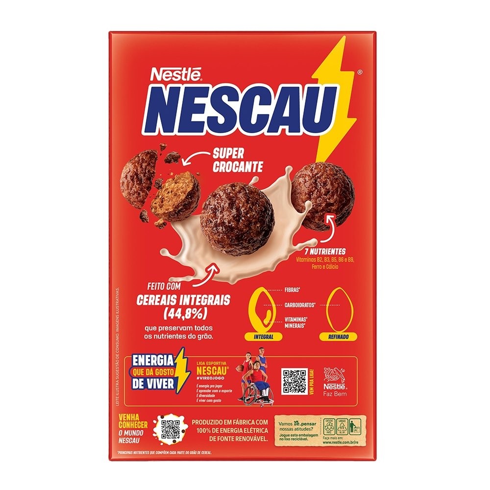 Características do Produto: Marca: Nescau Ingredientes: Farinha de milho integral (39%), farinha de milho enriquecida com ferro e ácido fólico (21%), açúcar, xarope de glicose, cacau em pó (3%), oleína de palma, minerais [cálcio (carbonato de cálcio), ferro (ferro eletrolítico) e zinco (óxido de zinco)] e vitaminas [ácido pantotênico (pantotenato de cálcio), niacina (nicotinamida), B2 (riboflavina), B6 (cloridrato de piridoxina) e ácido fólico (ácido N-pteroil-L-glutâmico)], sal, aromatizantes, antiumectante fosfato dicálcico, corante caramelo IV, estabilizante fosfato trissódico e antioxidante tocoferol. Alergênicos: Contém derivados de soja. Pode conter Amêndoas, leite, trigo, cevada, aveia e centeio. Contém Glúten Porção recomendada: 30g = 3/4 de xícara Modo de Conservação: Após aberto, feche bem a embalagem para conservar o produto fresco e crocante. Fornecedor - Nestlé