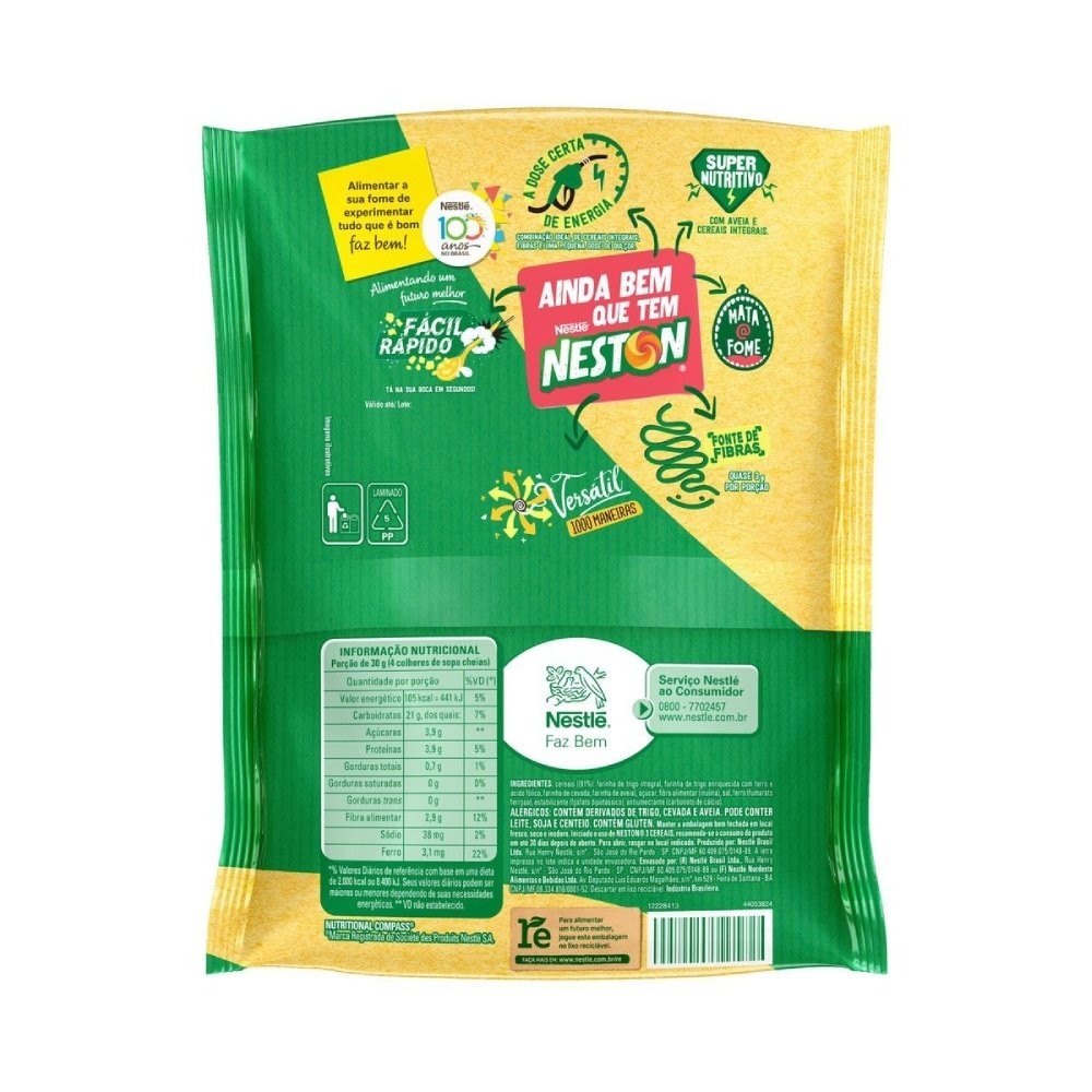 Características do produto: Marca: Neston Peso: 210g Sabor: 3 cereais Especificações gerais: NESTON® 3 Cereais em flocos com mix de Aveia, Cevada e Trigo., Adicionando uma crocância irresistível para as frutas, além de de conter fibras e ferro. Ingredientes: Farinha de trigo integral, farinha de trigo enriquecida com ferro ácido fólico, farinha de cevada, açúcar, farinha de aveia, inulina, sal, ferro (fumarato ferrosol), estabilizante fosfato dipotassico e antiumectante carbonato de cálcio. Alérgicos: Contém derivados de trigo, cevada e aveia. Pode conter leite soja e centeio. Contém Glúten. Conservação: Manter a lata sempre bem fechada em local fresco, seco e inodoro. Iniciado o uso de NESTON® 3 CEREAIS recomenda-se o consumo do produto em até 30 dias. Fornecedor: Nestlé