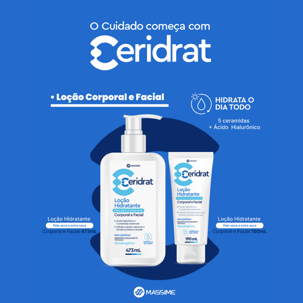 Desenvolvido e aprovado por dermatologistas, CERIDRAT é uma linha de hidratantes de alta performance a base de 5 Ceramidas e Ácido Hialurônico, para o cuidado que respeita a biologia da pele. Suas fórmulas são dermatologicamente testadas, seguras e eficazes na restauração e manutenção da barreira protetora da pele. Indicado para pessoas com pele seca a extra seca, sua textura é cremosa e de rápida absorção para uma sensação suave na pele. Com formulação rica e não oleosa, contém 5 Ceramidas essenciais para a pele com Ácido Hialurônico, eficazes na hidratação ao longo do dia, ajudando a restaurar a barreira protetora da pele, proporcionando suavidade imediata e diminuição dos sinais do ressecamento. ESPECIFICAÇÕES: - Hidratação que dura o dia todo; - Dermatologicamente testado; - Hipoalergênico - Corporal e Facial; - Para Pele Seca a Extra Seca; - Sem perfume; - Não testado em animais; - Ingredientes veganos; - Não contém parabenos (conservantes); - Não contém corantes; - Não-comedogênico (não provoca acne); - Não obstrui os poros; Marca: Massime Modelo: Creme Hidratante Volume: 190g Textura: Cremosa MODO DE USAR: Com a pele limpa e seca, aplique sempre que necessário. Considere utilizar continuamente ou conforme orientação do dermatologista. ATENÇÃO: * Uso externo. Produto formulado de maneira a minimizar possível surgimento de alergia. Em caso de irritação, suspenda o uso e procure orientação médica. Mantenha fora do alcance de crianças.