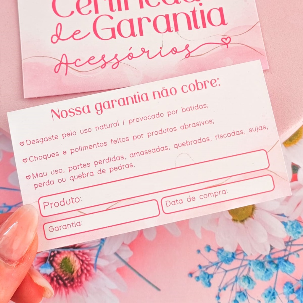 Certificado de garantia para acessórios-50 unidades Material : Papel Couché 250g brilho laminação verniz frente e verso fosco. Medidas :4,8x8,8 CM *ATENÇÃO* Esse produto é pronta entrega e não possui personalização.