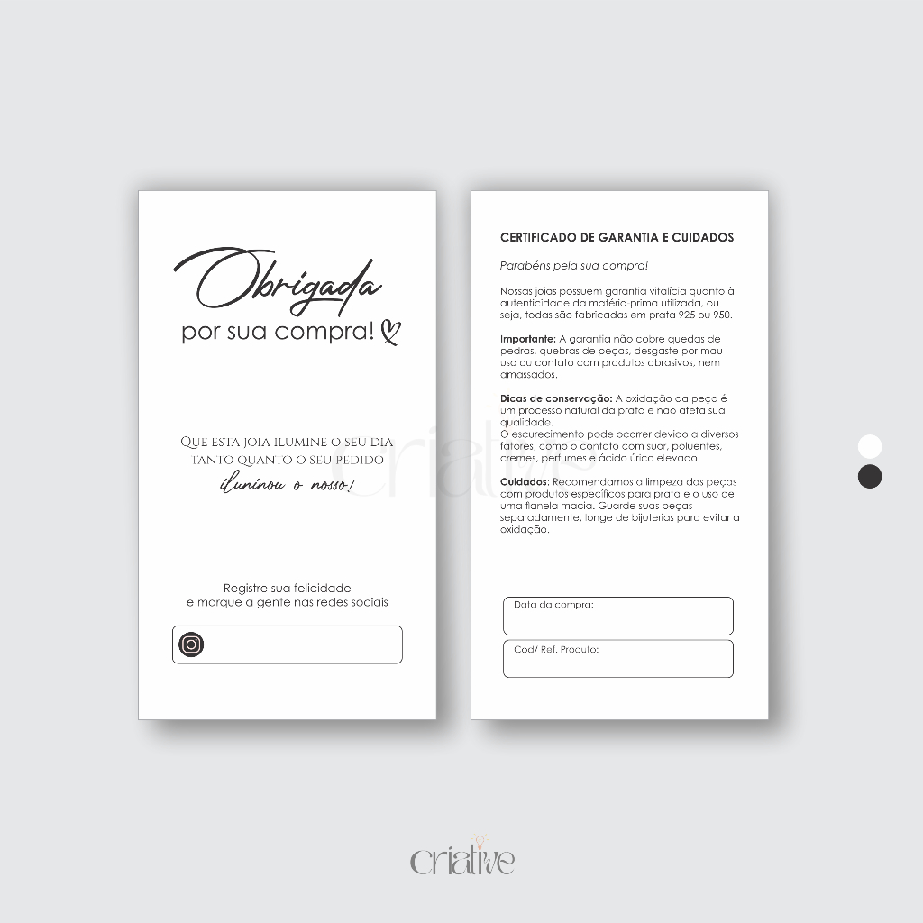 Certificado de Garantia Para Joia em Prata 925 - Branco - Papel Couche - 9x5 cm Destaque-se no mercado! 💎 Apresente suas joias com sofisticação e credibilidade e ofereça aos seus clientes uma experiência de compra mais completa e confiável com nosso Certificado de Garantia para Joias em Prata 925. Especificações: ✔ Quantidade: 25; 50 ou 100 unidades ✔ Dimensões: 9x5 cm ✔ Material: Papel Couchê Premium 250g, com excelente qualidade e acabamento elegante. ✔ ARTE PRONTA NÃO PERSONALIZADA. (Design exclusivo elegante Criative) ✔ Uso Ideal: Joias de prata 925, colares, brincos, anéis e pulseiras., agregando confiança e profissionalismo. Espaço frente e verso para você preencher com carimbo ou à caneta. (ITENS NÃO INCLUSOS) ✨ Atenção aos detalhes: As cores exibidas nas imagens podem apresentar variações sutis em relação ao produto final devido à calibragem de telas e processos de impressão. 🛒 Adicione ao carrinho agora mesmo e garanta o melhor para suas joias!💖