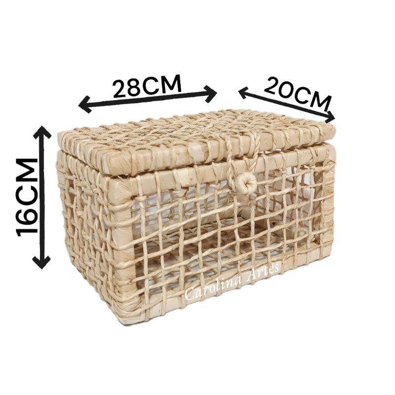 CONTÉM: 1 BAÚ ORGANIZADOR Nº2 Dimensões: Comprimento: 28cm Largura: 20cm Altura: 16cm A palha de milho consiste em fibras muito macias, flexíveis, leves e resistentes, por isso é muito bem empregada na confecção de artesanatos manuais, tanto decorativo como funcional. O trabalho é desenvolvido em fôrmas de madeira que irá proporcionar condições de criar varias alternativas, eles unem versatilidade durabilidade e delicadeza. Ideal para seu banheiro como porta sabonetes Também usado para dar de presente com trufas, chocolates Porta joias,objetos Feito de maneira artesanal 100% a mão Muito usado montar Cestas