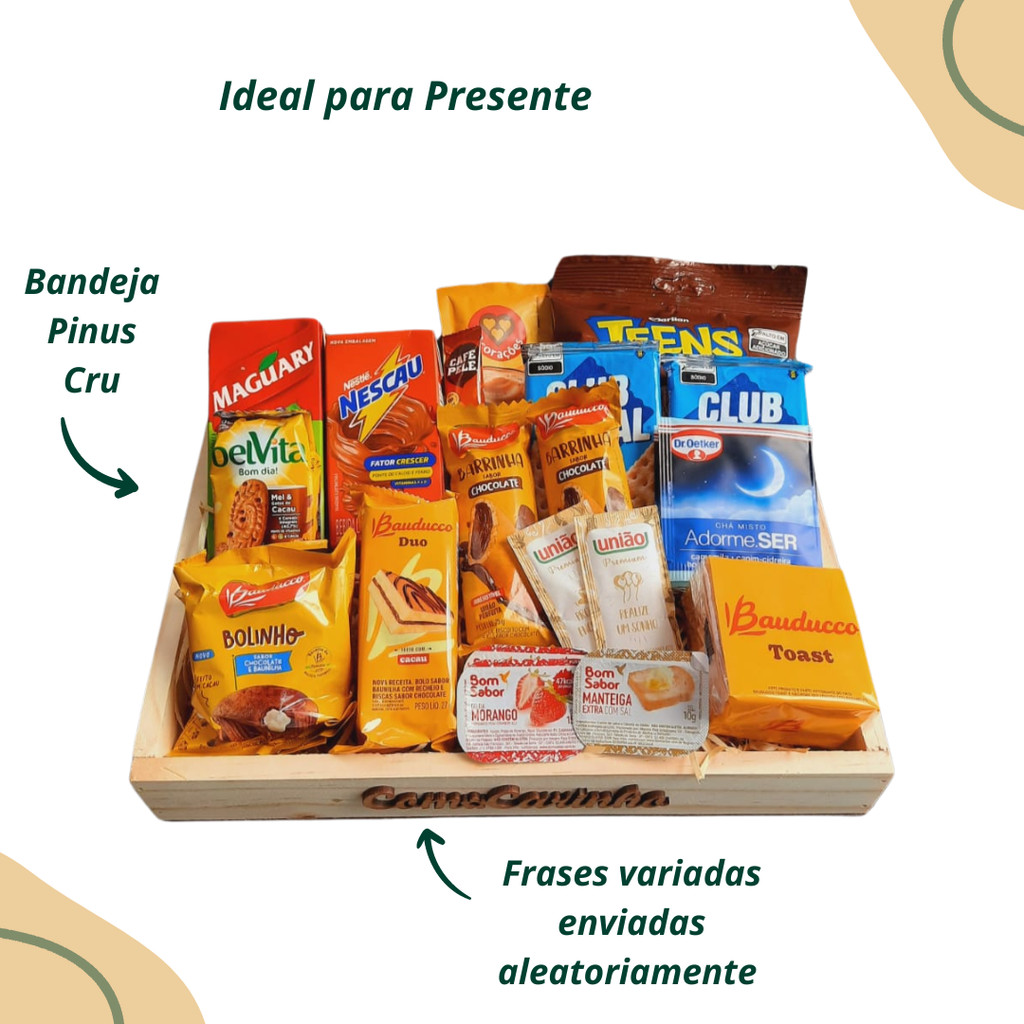 Nossos presentes são feito com amor carinho, utilizamos sempre produtos das melhores marcas do mercado, temos os produtos a pronta entrega. Todos os itens são enviados bem embrulhados para que cheguem intactos até você.As cestas já vão embrulhadas e prontas para presentear, com laço, celofane, embrulho de presente . Ideal para presentear namorado, mãe, amigo, esposo, esposa, filhos, amigo secreto.Contém 22 itens:1 Torrada Magic toast 21g1 Bolinho Bauducco 40g2 Club Social 24g2 Geléias 15g1 Manteiga 10g2 Sachê de Açúcar 5g2 Sachê de Chá1 Belvita 25g1 Bolinho Duo Bauducco 27g2 Barrinhas Maxi Bauducco 25g1 Sachê de Cappuccino 20g1 Biscoito Teens 20g1 Achocolatado 200ml1 Suco Caixinha 200ml1 Sachê de Café Solúvel 1,3g1 Cartão1 Bandeja Pinus Cru e Palha, que pode ser utilizada para decoração, maquiagem, bijouterias, etc.Nos disponibilizamos a enviar sua mensagem, impressa em papel decorado e cuidadosamente colocada junto aos itens do presente. Na falta de algum item enviaremos similar ou de maior valor.* Já vai embalada para presente, pronta para presentear.