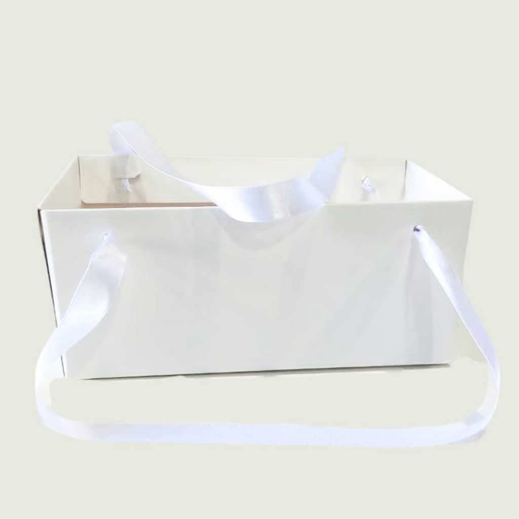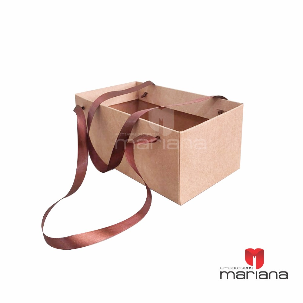 Cesta Kraft Com Alça Cetim (aprox 50 cm de alça) Alt. 9 cm Lar. 12 cm Comp. 21 cm Cor Kraft: Papel Kraft 350 gr Cor Branca: Papel Duplex 400 gr