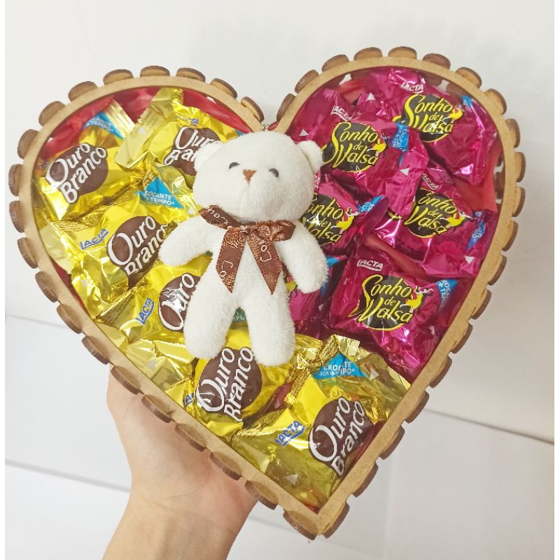 Linda cesta de bombons para presentear quem você ama. Tamanho do coração normal: 24cm Tamanho do coração mini: 18cm Lista dos produtos: No coração maior vai 12 bombons + ursinho chaveiro No coração menor vai 6 bombons + ursinho chaveiro Se quiser somente um sabor avise no chat. Se quiser mandar uma cartinha, envie o texto no chat (NO MOMENTO DA COMPRA), que vamos imprimir.
