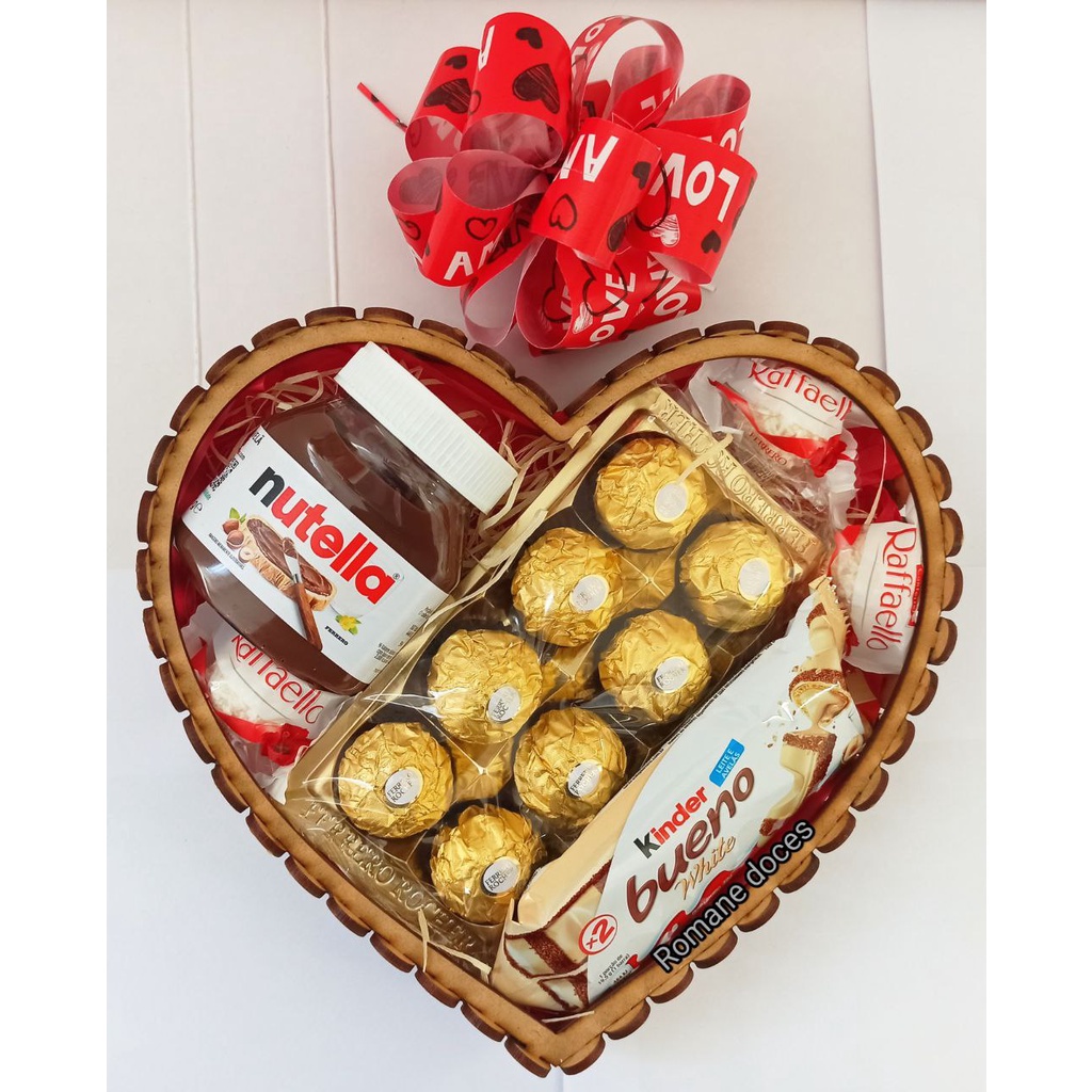 LINDA CESTA DE MDF PARA PRESENTEAR QUEM VOCÊ AMA! A cestinha é de mdf 24X22cm e contém: 8 Bombons Ferrero Rocher 1 Nutella 140g 1 Kinder Bueno 39g 3 Bombons Raffaello 1 Coração Mdf reutilizável No modelo COM URSINHO, vai um ursinho chaveirinho de 12cm. Se quiser uma cartinha, enviamos sem custo, nos chame no chat e envie seu texto NO MOMENTO DA COMPRA! OBS: A CESTA JÁ VAI MONTADA E MUITO BEM EMBALADA! DENTRO DA CAIXA VAI UMAS CAIXINHAS DE DOCES VAZIAS PARA AJUDAR A NÃO AMASSAR A CESTA DURANTE O TRANSPORTE! OBS: SE FALTAR ALGUM PRODUTO NA LOJA, SERÁ SUBSTITUÍDO POR OUTRO DE VALOR SEMELHANTE!