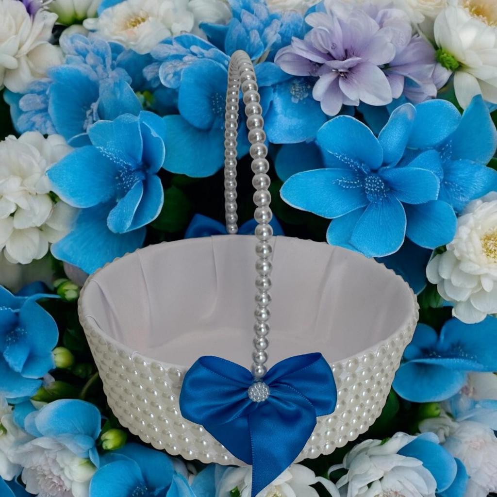 Cesta florista Perolas Daminha Laços Azul Royal