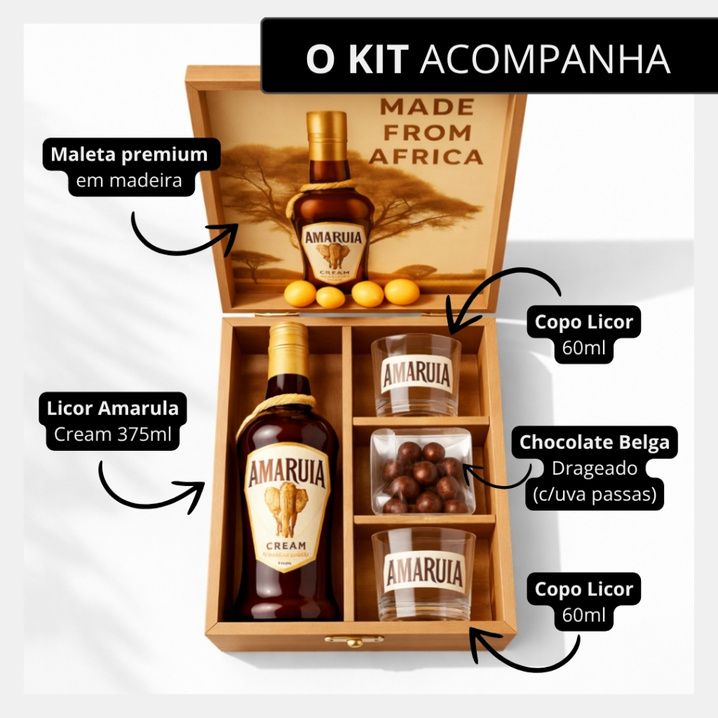 Cesta Kit Licor Amarula 375ml Maleta Madeira. Presente Aniversário Brinde - PERSONALIZE COM NOME OU LOGO!