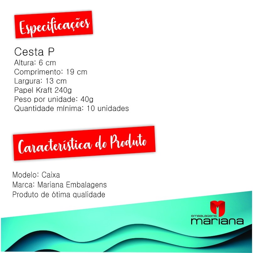 Cesta P Altura: 6 cm Comprimento: 19 cm Largura: 13 cm Papel Kraft 240g Peso por unidade: 40g Quantidade mínima: 10 unidades Modelo: Caixa Marca: Mariana Embalagens Produto de ótima qualidade