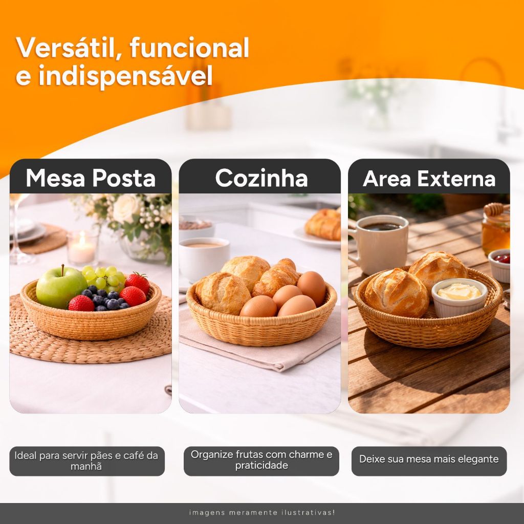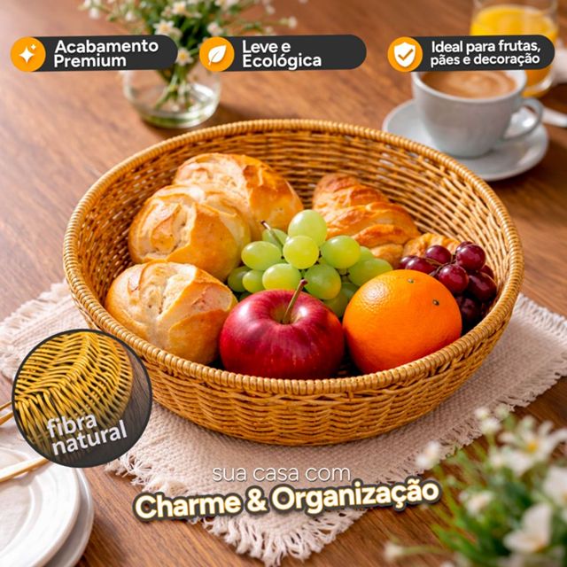 | Cesta Pão Frutas Redonda Trançada Vime Natural Rústica Mesa Posta C... este produto | R$ 31,90 | 36% | 4.3/5 | 4 |
