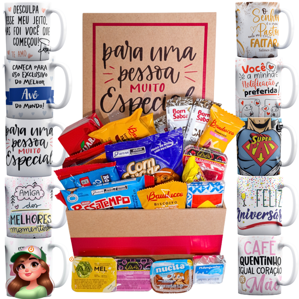 Cestas para Café da Manhã Completo com 32 itens + Caneca a Sua Escolha