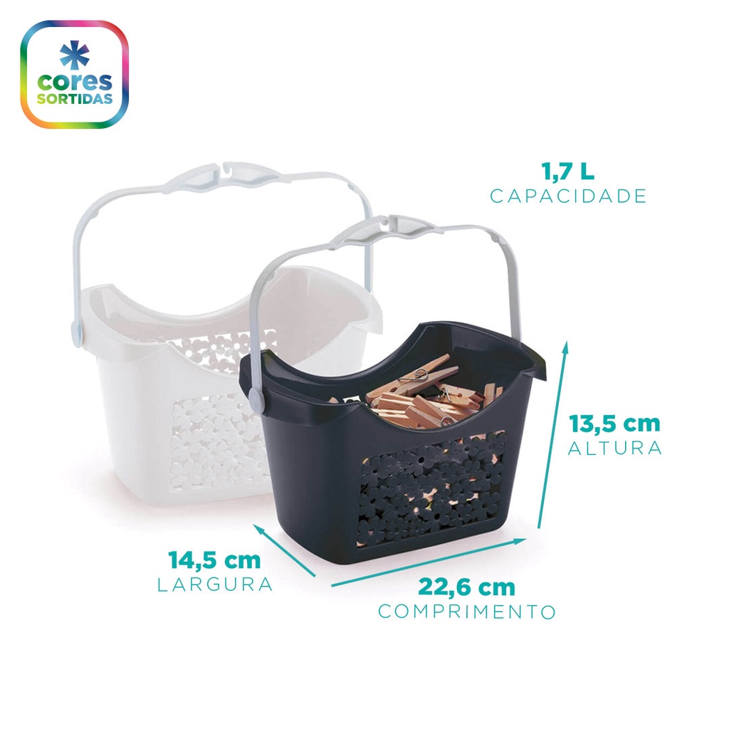 CESTINHO PARA PRENDEDOR FLORAL NITRON _______________________________________ DESCRITIVO: Peso: 130 g Largura: 14 cm Comprimento: 23 cm Altura: 14 cm Capacidade: 1,7 L _______________________________________ DIFERENCIAIS: BPA Free (Livre de BPA - O BPA é uma substância química que faz mal à saúde) Design alegre que se adequa em todos os momentos Material incrivelmente resistente _______________________________________