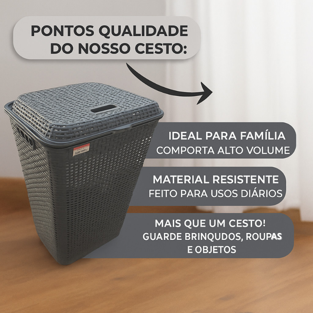 O cesto de roupa suja 72 litros gigante com tampa é a escolha ideal para quem precisa de grande capacidade, resistência e organização no dia a dia, sendo perfeito para famílias e ambientes com alto volume de roupas. Fabricado em plástico rígido reforçado de alta durabilidade, oferece estrutura super resistente que não deforma mesmo quando totalmente cheio. A tampa com encaixe firme auxilia no controle de odores, mantém o ambiente mais discreto e contribui para uma aparência organizada na lavanderia, banheiro, quarto ou área de serviço. Seu design moderno combina facilmente com qualquer ambiente, enquanto a superfície lisa facilita a higienização rápida com pano úmido e detergente neutro. Leve e fácil de transportar mesmo cheio, o cesto também pode ser utilizado de forma multiuso para armazenar roupas, toalhas, brinquedos e outros itens de organização geral, sendo indicado tanto para uso residencial quanto para ambientes comerciais. Medidas Altura: 62 cm Largura inferior: 35 cm Largura posterior: 45 cm Comprimento inferior: 27 cm Comprimento posterior: 35 cm Dimensões gerais: 44 x 62 cm Características Material: plástico rígido reforçado de alta durabilidade Capacidade: 72 litros Tampa com encaixe firme para controle de odores Estrutura super resistente que não deforma com o peso das roupas Design moderno compatível com qualquer ambiente Superfície lisa para fácil higienização Leve e fácil de transportar Uso indicado: lavanderia, banheiro, quarto, área de serviço e ambientes comerciais Cuidados Limpar com pano úmido e detergente neutro Não utilizar produtos abrasivos Evitar exposição prolongada ao sol intenso Não apoiar peso excessivo sobre a tampa Acompanha 1 Cesto de Roupa Suja 72L com Tampa