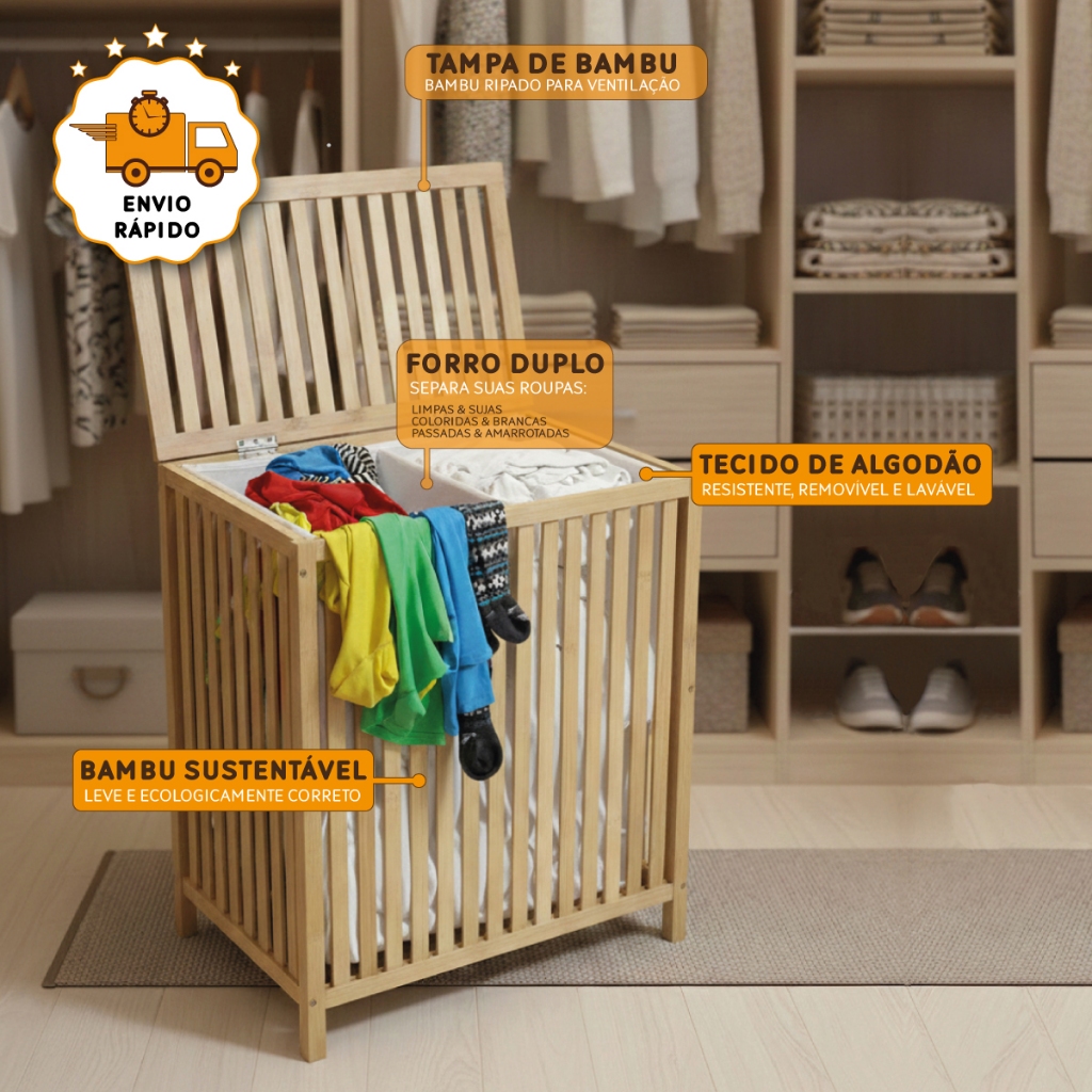 Cesto De Roupa Suja Bambu Ripado Tampa Natural Com Forro Duplo Removível Lavável