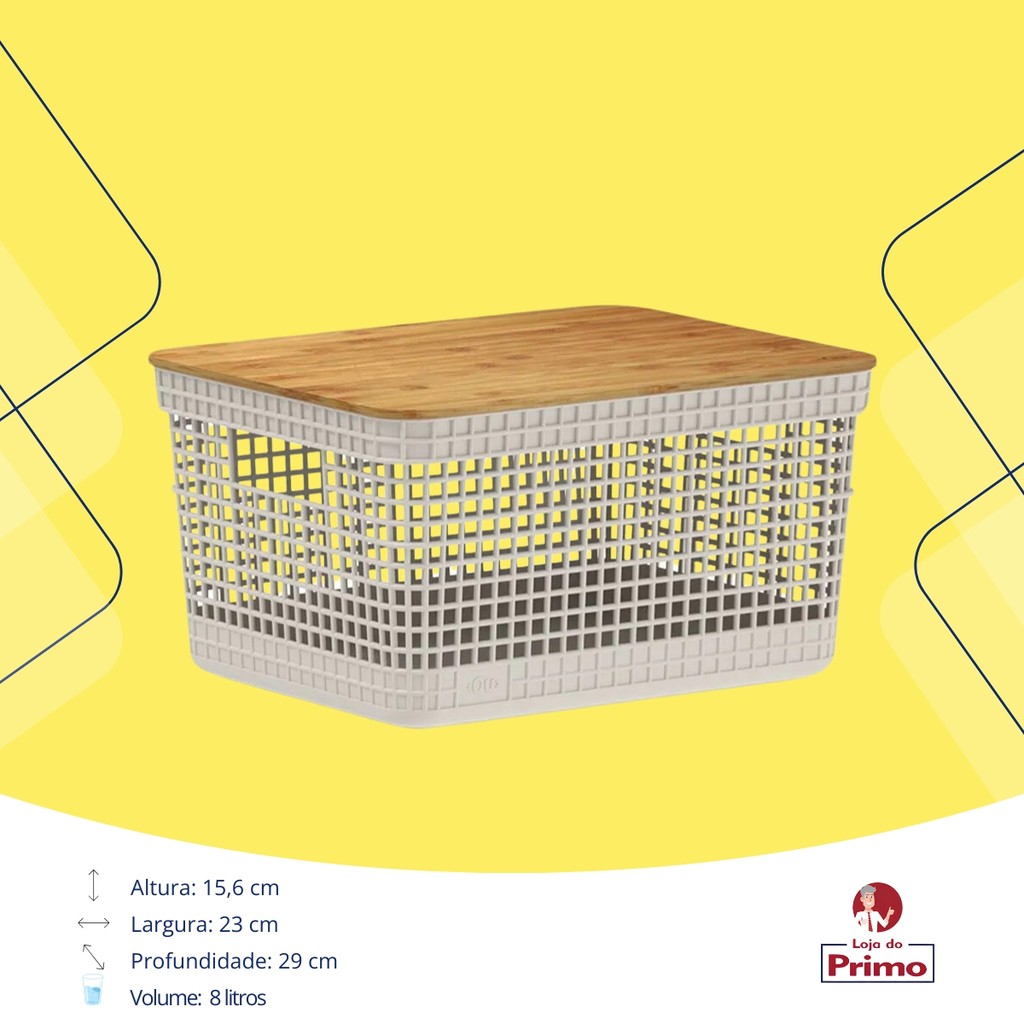 Cesto Organizador Em Plástico Para Escritório Banheiro Lavabo Bege Tampa Bambu 8l OU A linha de Cestos Grid foi criada para oferecer o equilíbrio perfeito entre design moderno, funcionalidade e conforto. Versátil e elegante, o Cesto Organizador Grid é ideal para manter sua casa organizada, complementando a decoração de ambientes como closets, cozinhas, lavanderias ou até mesmo a sala de estar. O grande destaque está na tampa em bambu, que adiciona um toque de sofisticação e naturalidade a qualquer espaço, tornando este item mais do que um simples organizador — é uma peça decorativa que valoriza o ambiente. Especificações do Produto: - Marca: OU Material: PP (Polipropileno) + Bambu Dimensões: - Profundidade: 29 cm Largura: 23 cm Altura: 15,6 cm - Capacidade: 8 litros Benefícios: - Multifuncional: Perfeito para armazenar itens diversos em diferentes ambientes. - Design sofisticado: Combina o moderno com o natural, graças à tampa de bambu. Durabilidade: Fabricado em materiais resistentes, como o polipropileno. - Compacto e funcional: Ideal para otimizar espaços sem comprometer o estilo. Leve mais organização e charme para o seu dia a dia com os Cestos Grid, a escolha certa para quem deseja unir praticidade e beleza em um único produto.