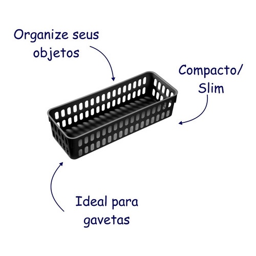 Cesto Organizador multiuso em plástico (Slim G) Os Cestos são muito úteis para organizar e otimizar ambientes como cozinha, banheiros, lavanderias, closets, escritórios, despensas e lojas. Fácil manuseio com suas pegas laterais. Cestos compatíveis para organização de suas gavetas. Ideal para organizar alimentos, temperos, condimentos, cosméticos, potes, latas, maquiagens, esmaltes, bijuterias, acessórios, aviamentos, ferramentas, ferragens, medicamentos, produtos de higiene pessoal, material de escritório, material escolar, material de pesca, brinquedos, prendedores, escovas, produtos de limpeza e utilidades domésticas em geral. Os produtos possuem um lindo design, que misturam modernidade e sofisticação, proporcionando um toque de sutileza e elegância ao seu ambiente. Envio em até 24h, comprou, chegou! Medidas aproximadas: Altura: 8 cm Largura: 13 cm Comprimento: 34 cm Material: Plástico (Atóxico/Não perecível) COMPRA 100% SEGURA: Somos vendedores em Marketplaces a mais de 7 anos! Manutenção e Limpeza: Limpar com um pano seco. Não usar produtos que contenham solventes, abrasivos ou amônia. Evitar a exposição à luz solar e umidade excessiva.