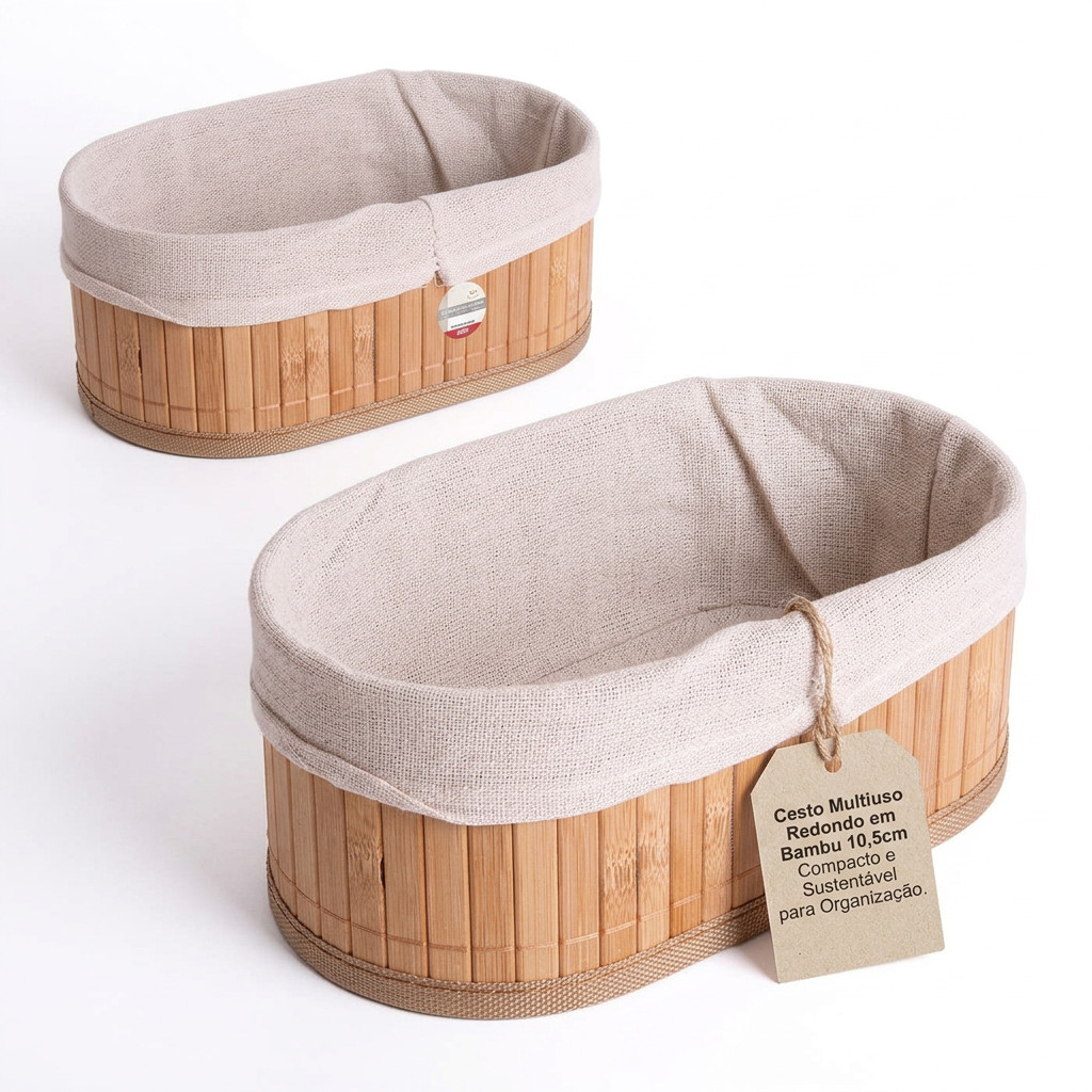 Compacto e funcional, este cesto multiuso redondo em bambu de 10,5cm é ideal para armazenar pequenos itens, mantendo seu espaço organizado e bonito. Fabricado em bambu natural, combina resistência com sustentabilidade, sendo um produto ecológico para seu lar ou escritório. Seu design simples e elegante harmoniza com diferentes estilos de decoração, proporcionando praticidade sem abrir mão do charme. Um acessório indispensável para quem busca organização eficiente e consciente.