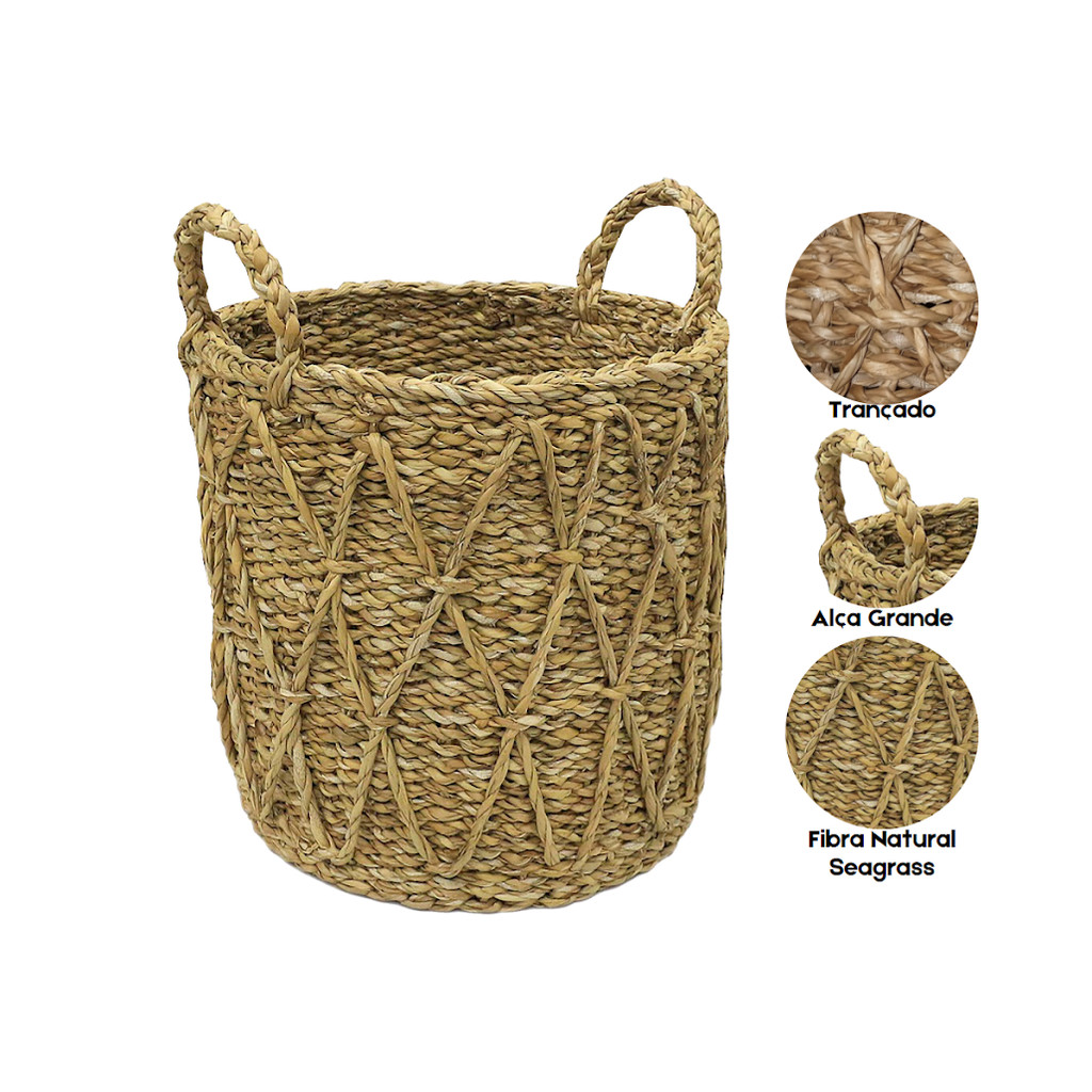 Cesto Organizador c/ Alça Decorativo Em Fibra Natural Grande Lavanderia Banheiro Plantas Cachepot