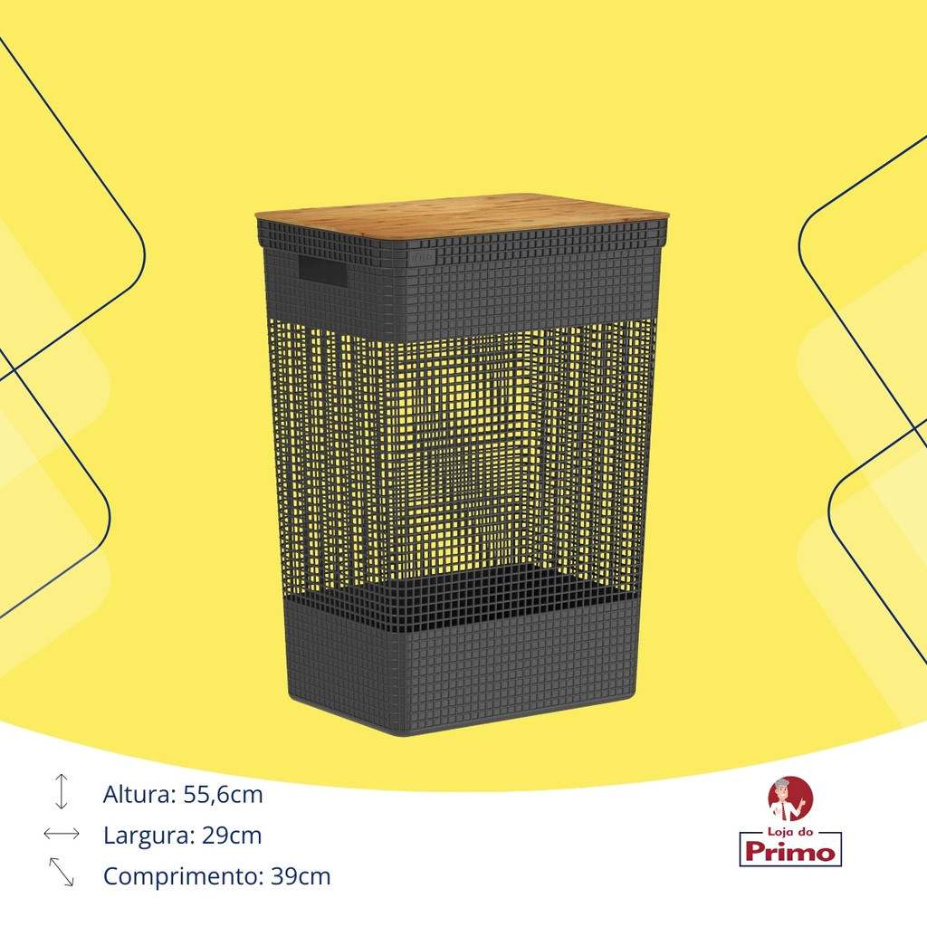 Cesto Organizador de Roupas com Tampa de Bambu - 49L, Cor Preto Descrição: Mantenha suas roupas organizadas com estilo e praticidade com o Cesto Organizador de Roupas de 49 litros. Perfeito para a lavanderia, área de serviço, banheiro ou quarto, este cesto combina funcionalidade e um design moderno que se destaca em qualquer ambiente. A tampa de bambu adiciona um toque natural e elegante, enquanto o corpo na cor preta oferece um visual sofisticado e contemporâneo. Características Principais: - Capacidade Generosa de 49 Litros: Com espaço amplo, este cesto é ideal para armazenar roupas sujas ou limpas, garantindo que sua lavanderia, quarto ou banheiro fiquem sempre organizados. - Tampa de Bambu Natural: A tampa feita de bambu não só proporciona um toque natural e sofisticado, mas também ajuda a manter as roupas fora de vista, preservando a aparência limpa e arrumada do ambiente. - Design Moderno e Sofisticado: Com um corpo na cor preta e linhas elegantes, o cesto se adapta facilmente a diferentes estilos de decoração, adicionando um elemento de design funcional ao espaço. - Material Durável e Resistente: O cesto é fabricado em material resistente, projetado para suportar o uso diário sem perder sua forma ou funcionalidade. - Leve e Fácil de Transportar: Mesmo com sua grande capacidade, o cesto é leve e possui alças laterais que facilitam o transporte, permitindo que você mova-o facilmente pela casa. Especificações: - Material: Plástico resistente com tampa de bambu - Capacidade: 49 litros - Dimensões: 38x28x55,2 - Cor: Preto com tampa de bambu - Peso: 0,980kg Benefícios: - Organização e Estilo: Mantenha suas roupas organizadas de maneira elegante, com um cesto que combina funcionalidade e design. - Versatilidade de Uso: Adequado para diversos ambientes da casa, como lavanderia, área de serviço, banheiro ou quarto, adaptando-se às suas necessidades de armazenamento. - Durabilidade e Sustentabilidade: A combinação de materiais duráveis e o uso de bambu sustentável garantem que o cesto seja tanto funcional quanto ecologicamente responsável. Por que Escolher o Cesto Organizador de Roupas com Tampa de Bambu? O Cesto Organizador de Roupas com Tampa de Bambu é a escolha ideal para quem busca uma solução prática e estilosa para o armazenamento de roupas. Com uma capacidade generosa de 49 litros, ele é perfeito para manter a organização da sua casa, enquanto seu design elegante e a tampa de bambu adicionam um toque de sofisticação ao ambiente. Adquira agora o Cesto Organizador de Roupas e transforme sua rotina com organização e estilo! Loja do Primo Variedades!
