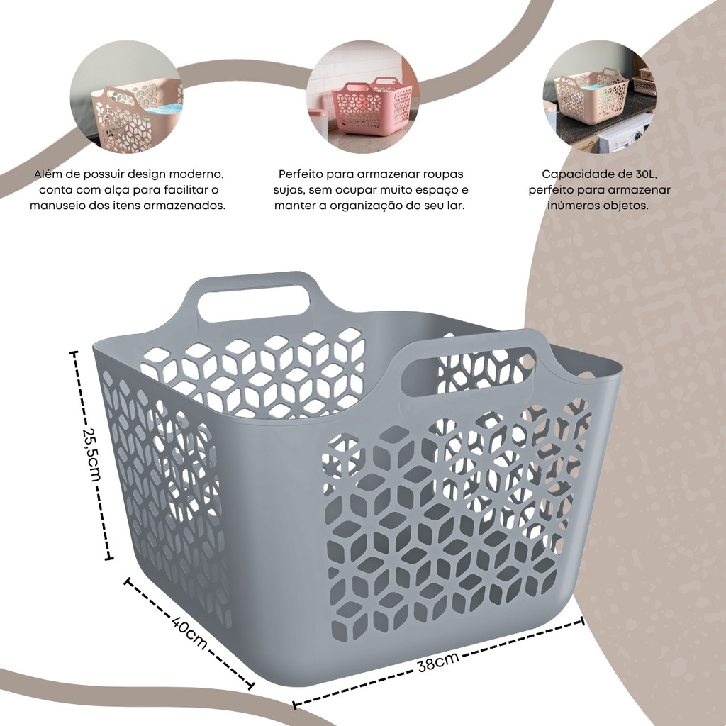 Cesto Médio Multiuso 30L Com Alça Cinza UZ419 - Cores O Cesto De Roupas Com Alça 30 Litros é perfeita para aliar organização e praticidade no seu dia a dia. A linha foi desenvolvida priorizando o cuidado com a sua rotina, por isso, possui furos que facilitam a ventilação e bordas maiores que facilitam a pega e transporte. Na lavanderia ou no quarto, para uma casa organizada e com mais cor, as cestas organizadoras são suas aliadas perfeitas para auxiliar no seu dia a dia. Diferenciais: - Fabricado em plástico PP; - Fácil de limpar; - Resistente e durável; - Design moderno e compacto; - Otimiza e organiza o espaço; Especificações: - Marca: UZ; - Modelo: UZ419; - Linha: Lavanderia; - Material: Plástico Polipropileno. Dimensões: - Altura: 25,5cm; - Largura: 38cm; - Comprimento: 40cm; Cuidados: Sugere-se higienizar com sabão neutro e esponja macia, evitando produtos abrasivos no processo de limpeza. Dúvidas? Entre em contato através da caixa de perguntas, temos uma equipe pronta para te atender! A equipe SB Magazine agradece a preferência. (: