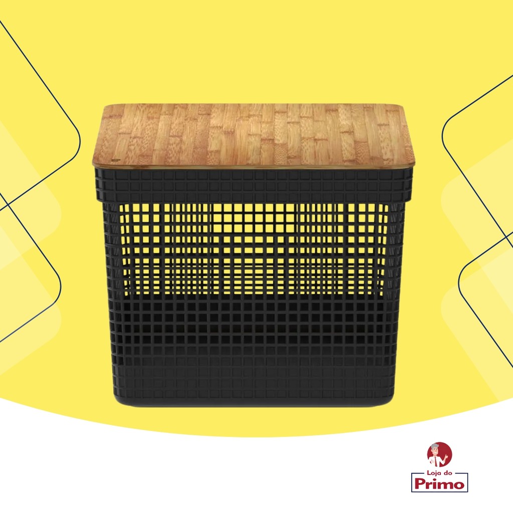 Cesto Organizador Roupas Lavanderia Área De Serviço Banheiro Quarto Tampa Bambu Grid 20l Preto OU