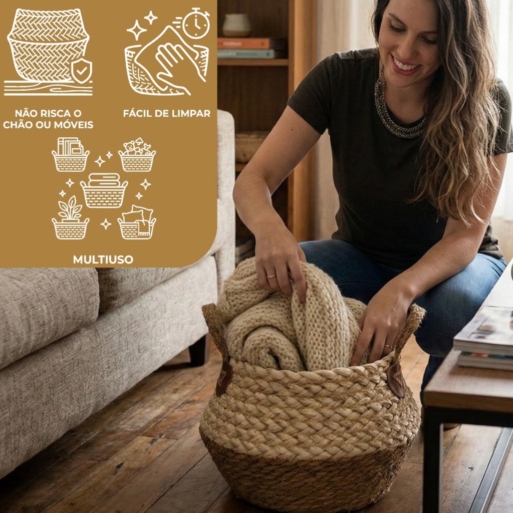 Cesto de Fibra Natural Cachepot - Elegância e Funcionalidade para sua Decoração Adicione um toque de charme e funcionalidade à sua decoração com este cesto cachepot de fibra natural. Feito artesanalmente em palha e corda, ele é a peça perfeita para dar um toque rústico e acolhedor a qualquer ambiente, seja em casa, no escritório ou no jardim. Versátil e Multifuncional: • Cachepot para Plantas: Perfeito para cobrir vasos de plantas e renovar seu espaço verde. • Organizador Decorativo: Use-o para guardar mantas, toalhas, revistas, brinquedos ou outros objetos, mantendo tudo arrumado e estiloso. Características do Produto • Material: Palha e corda resistentes • Design: Artesanal, com alças que facilitam o transporte • Base Protetora: Acompanha uma base de plástico interna para maior proteção e durabilidade, especialmente ao ser usado como cachepot. • Estilo: Combina com diversos estilos de decoração, do Boho ao Rústico. Dimensões disponíveis: • Médio: 25 cm de altura x 25 cm de diâmetro (fundo/base) • Por ser um produto artesanal, podem ocorrer pequenas variações de cor, tamanho e textura, o que garante a autenticidade e a beleza de cada peça. Observações Importantes: • Este cesto foi feito para ser usado como cachepot e não é recomendado plantar diretamente nele. • A planta e o vaso não estão inclusos. Transforme seus espaços com esta peça elegante e funcional!