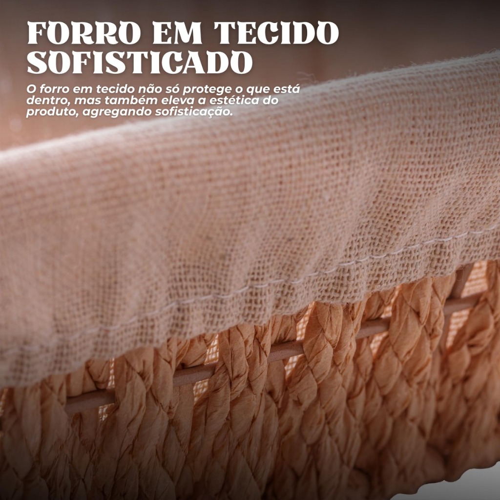 Cesto Retangular de Papel com Forro em Tecido e Alça Pão Mesa Posta Organização Lavabo e Decoração Multiuso Wolff A Cesta com Alça Wolff é perfeita para decorar e organizar ambientes, unindo funcionalidade e elegância. Feita em fibra de papel trançada, ela possui um formato retangular que se adapta a diversos espaços e um forro em tecido removível, fácil de lavar e manter limpo. Ideal para uso na cozinha, sala, banheiro ou quarto, é excelente para armazenar pães, frutas, cosméticos, toalhas de rosto e pequenos objetos. A alça facilita o transporte e adiciona um toque rústico e sofisticado à decoração. Especificações Técnicas: • Material da Estrutura: Fibra de papel trançada • Material do Forro: Tecido (removível e lavável) • Formato: Retangular • Cor: Natural (papel) com forro neutro • Com alça: Sim • Uso indicado: Organização e decoração • Manutenção: Limpar com pano seco; forro pode ser lavado separadamente Dimensões do Produto: • Comprimento: 31 cm • Largura: 19 cm • Altura: 12 cm FAQ – Perguntas Frequentes: 1. Posso lavar a cesta? A estrutura não deve ser molhada. Apenas o forro em tecido pode ser lavado. 2. É resistente para carregar objetos pesados? Indicada para itens leves e médios, evitando sobrepeso para preservar a estrutura. 3. O forro é fixo? Não, ele é removível para facilitar a higienização.