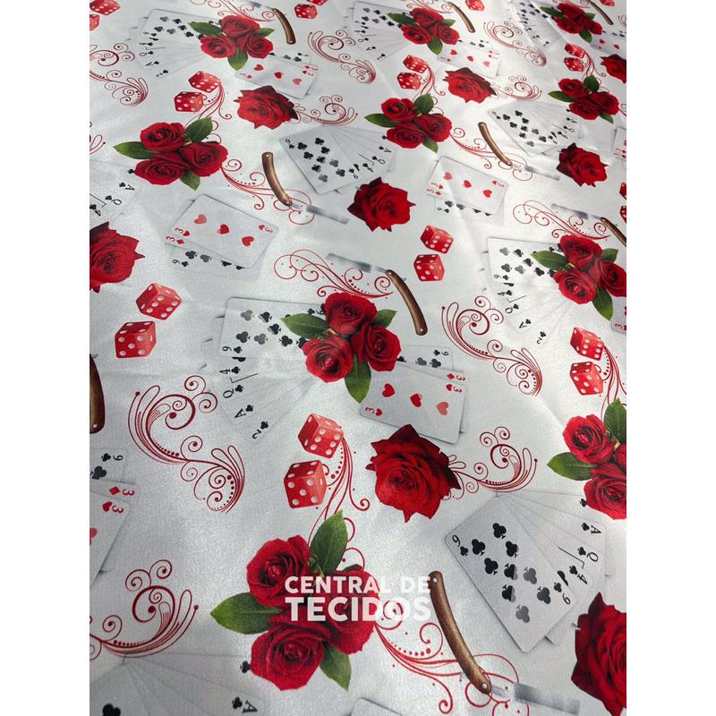 Cetim Estampado Digital Baralho Cartas Rosas Navalha