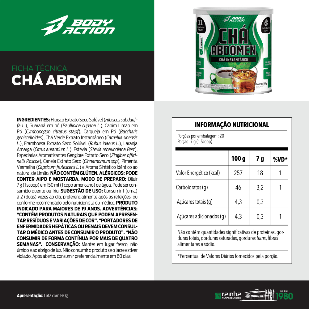 CHÁ ABDOMEN INGREDIENTES: Hibisco Extrato Seco Solúvel (Hibiscos sabdariffa L.), Guaraná em pó (Paullinina cupana L.), Capim Limão em Pó (Cymbopogon citratus stapf), Carqueja em Pó (Baccharis genistelloides), Chá Verde Extrato Instantâneo (Camellia sinensis L.), Framboesa Extrato Seco Solúvel (Rubus idaeus L.), Laranja Amarga (Citrus aurantium L.), Estévia (Stevia rebaundiana Bert), Especiarias Aromatizantes Gengibre Extrato Seco (Zingiber officinalis Roscoe), Canela Extrato Seco (Cinnamomum spp), Pimenta Vermelha (Capsicum frutescens L.) e Aroma Sintético Idêntico ao natural de Limão. NÃO CONTÉM GLÚTEN. ALÉRGICOS: PODE CONTER AIPO E MOSTARDA. MODO DE PREPARO: Diluir 7 g (1 scoop) em 150 ml (1 copo americano) de água. Pode ser consumido quente ou frio. SUGESTÃO DE USO: Consumir 1 (uma) à 2 (duas) vezes ao dia, preferencialmente após as refeições, ou conforme recomendado pelo nutricionista ou médico. INDICADO PARA MAIORES DE 19 ANOS. ADVERTÊNCIAS: “CONTÉM PRODUTOS NATURAIS QUE PODEM APRESENTAR RESÍDUOS E VARIAÇÕES DE COR”. “PORTADORES DE ENFERMIDADES HEPÁTICAS OU RENAIS DEVEM CONSULTAR O MÉDICO ANTES DE CONSUMIR O PRODUTO”. “NÃO CONSUMIR DE FORMA CONTÍNUA POR MAIS DE QUATRO SEMANAS”. CONSERVAÇÃO: Manter em lugar fresco, não úmido e ao abrigo de luz. Não consumir o produto se o lacre estiver violado. Após aberto, consumir preferencialmente em 60 dias. __________________________________________ THERMO ABDOMEN BLACK® INGREDIENTES: Cafeína Anidra, Extrato de Guaraná em pó, Extrato de Laranja Moro (Citrus sinensis (L.) Osbeck), Estabilizante Carbonato de Cálcio e Antiumectantes Estearato de Magnésio e Dióxido de Silício. INGREDIENTES DO REVESTIMENTO: Glaceante Polietilenoglicol, Estabilizante Polivinilpirrolidona e Corantes Dióxido de Titânio e Vermelho 40. NÃO CONTÉM GLÚTEN. SUGESTÃO DE USO: Consumir 2 (dois) tabletes ao dia, sendo 1 (um) pela manhã e 1 (um) após o almoço ou conforme orientação de nutricionista ou médico. PRODUTO INDICADO PARA MAIORES DE 19 ANOS. EXCLUSIVO PARA ATLETAS. ADVERTÊNCIAS: “ESTE PRODUTO NÃO É UM MEDICAMENTO”. “NÃO EXCEDER A RECOMENDAÇÃO DIÁRIA DE CONSUMO INDICADA NA EMBALAGEM”. “MANTENHA FORA DO ALCANCE DE CRIANÇAS”. “ESTE PRODUTO NÃO DEVE SER CONSUMIDO POR GESTANTES, LACTANTES E CRIANÇAS”. CONSERVAÇÃO: Manter em lugar fresco, não úmido e ao abrigo de luz. Não consumir o produto se a embalagem de proteção estiver violada. Após aberto consumir em até 60 dias.