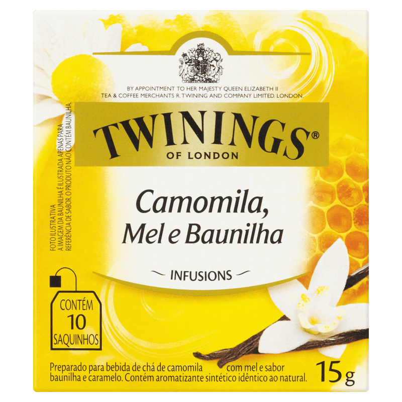 SUAVE E ADOCICADO: A Twinings elabora este chá com camomila e os sabores naturalmente doces de mel e baunilha, proporcionando um chá suave, com aroma cremoso e sabor aveludado. O JEITO FÁCIL DE SE SENTIR BEM: Deliciosos quentes ou gelados, nossos chás de infusão de frutas e ervas são cheios de cor, vida e sabor. Uma maneira fácil de fazer você se sentir bem. Naturalmente sem açúcar e sem cafeína. SUSTENTABILIDADE: A Twinings lançou o programa Sourced with Care para melhorar a qualidade de vida nas comunidades de onde obtemos nossos ingredientes. Nossa visão é ter comunidades mais saudáveis, felizes, empoderadas e sustentáveis em nossa cadeia de suprimentos. A Twinings possui certificação Rainforest Alliance. TWININGS: Há mais de 300 anos, a Twinings cria chás e infusões requintados. Selecionando os melhores ingredientes naturais de todo o mundo, nossos mestres blenders criam chás e infusões cheios de sabor e aroma com maestria. Sabor: Doce e aveludado, com notas de mel e baunilha. Aroma: Delicado e floral, com leve toque adocicado. Prove com: Puro ou com um toque de mel. Tipo de Intensidade: Leve Peso: 17,5g Origem: Produzido na Polônia, com a tradição e qualidade inglesa da Twinings. Número de Sachês: 10 Benefícios para Saúde: Auxilia no relaxamento, melhora o humor e ajuda na qualidade do sono. Ingredientes: Capítulos florais de camomila, mel e aromatizantes de baunilha. Não contém glúten. Tipo de embalagem: Caixa com sachês individuais. Armazenagem: Local fresco, seco e em temperatura ambiente. Benefícios: ? Calmante e reconfortante. ? Ideal para o fim do dia. ? Produzido com ingredientes de origem sustentável e certificação “Rainforest Alliance”. Modo de Preparo: 1. Coloque 1 sachê Twinings em 200 ml de água fervente. 2. Deixe em infusão de 3 a 4 minutos. 3. Retire o sachê e adoce, se desejar. 4. Para servir gelado, adicione gelo ou leve à geladeira.
