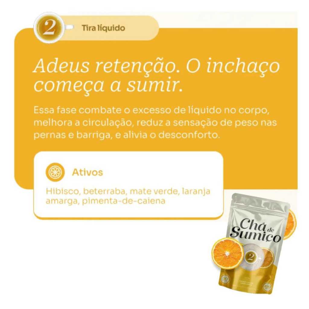 O Chá de Sumiço 21 Dias é um kit com 3 sabores solúveis pensado para quem gosta de chá e quer algo diferente, prático e fácil de preparar. É um produto organizado em fases de sabores, trazendo variedade ao longo dos dias e uma forma simples de incluir o consumo de chá na rotina. Nada de complicação. Misturou, mexeu, pronto. 📦 O KIT CONTÉM ✔ 3 embalagens de Chá de Sumiço ✔ 3 sabores diferentes ✔ Produto solúvel ✔ Rendimento para uso diário ✔ Preparo rápido ☕ COMO PREPARAR Adicione o conteúdo na água, mexa bem e consuma. Pode ser preparado quente ou gelado. ⭐ DIFERENCIAL * Sabores variados * Produto solúvel * Praticidade no dia a dia * Não precisa coar * Fácil de levar 📌 INFORMAÇÃO IMPORTANTE Produto para preparo de bebida sabor chá. Não é medicamento.