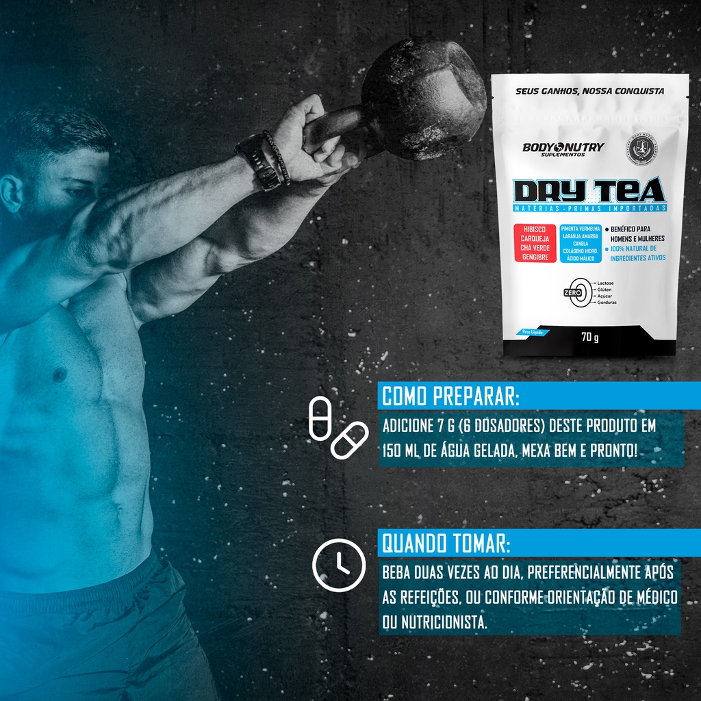 DRY TEA é um chá diurético (DETOX) misto com especiarias 100% natural e importado. Auxilia na prevenção de retenção de líquidos e contribui na desintoxicação do organismo. Sua fórmula traz a combinação de hibisco, chá verde, carqueja, laranja amarga, gengibre, canela e pimenta doce, ingredientes esses que fornecem uma ação diurética. Benefícios: • Mix de ervas e especiarías • Auxilia no emagrecimento • Ação diurética • O mais recomendado por nutricionistas • 100% NATURAL • Muito saboroso e de fácil dissolução ANÚNCIO CONTÉM: 1x Dry Tea Body Nutry, refi 70 g PERGUNTAS FREQUENTES (FAQ): PRODUTO NOVO, ORIGINAL, LACRADO e autorizado pela ANVISA. Possuímos todos os itens anunciados em estoque, com envio imediato. VALIDADE: Todos os produtos são de no mínimo 1 ano e 4 meses de validade. GARANTIA: 1 MÊS de garantia pelo vendedor e 1 ANO de garantia pelo fabricante.