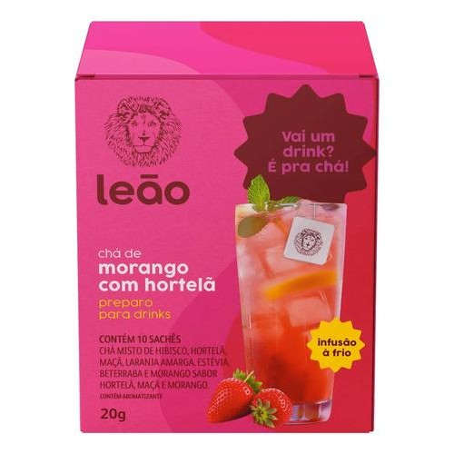 Não perca mais tempo preparando drinks. A Leão mais uma vez inova no mercado nacional oferecendo sachês para preparo de drinks nos sabores pêssego e morango e hortelã para preparo em água quente, fria ou direto para finalizar a sua bebida alcóolica. Uma bebida versátil que pode ser preparada tanto em água quente, fria ou até mesmo direto na bebida alcóolica. Testado em Vokda, Gin, Whisky, Espumante e água com e sem gás. O Match entre o Chá e o Drink. Em um recipiente você mistura uma dose de animação, dois ramos de aventura e uma colher de gargalhadas. Acrescente os seus melhores amigos e uma porção de bons momentos. Uma bebida versátil de Leão que pode ser preparada tanto em água quente, fria ou até mesmo direto na bebida alcóolica para animar o seu esquenta!Ingredientes: Flores de hibisco (Hibiscus sabdariffa L.), frutos da maçã (Pyrus malus L.), folhas e ramos de hortelã (Mentha piperita L.), folhas de estévia (Stevia rebaudiana Bert), casca dos frutos da laranja amarga (Citrus aurantium L.), raízes de beterraba (Beta vulgaris L.), frutos do morango (Fragaria spp.) e aromatizantes.