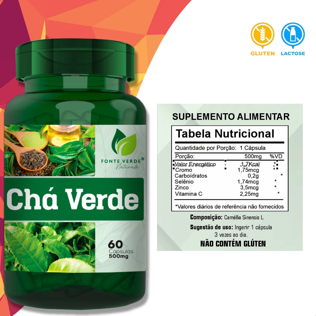 INFORMAÇÕES: - Cada frasco contém 120 cápsulas de 500mg; - Feito com ingredientes naturais, sem corantes, conservantes ou aditivos químicos; - As cápsulas são fáceis de ingerir e de incorporar à sua rotina diária; - Validade de aproximadamente 24 meses a partir do mês da compra. - Não contém Glúten - Não contém Lactose Chá Verde: O Chá Verde é um suplemento 100% natural que auxilia no combate a retenção de líquidos no organismo e na regulação do intestino. É utilizado para ajudar a prevenir diabetes, além de auxiliar na perda de peso e melhorar a disposição física e mental. Conhecido por ser uma grande fonte de antioxidante, o chá verde contém em si cafeína, flavonoides e catequinas que, além de contribuir para uma ação anti inflamatória, antibacteriana e antiviral natural, ajudam, também, a acelerar o metabolismo, estimulando o organismo a utilizar mais energias ajudando na digestão de alimentos. MODO SUGERIDO DE USAR - Ingerir 1(uma) cápsula 3(três) vezes ao dia; - Ingerir com bastante água; CONTRAINDICAÇÃO - Gestantes - Lactantes - Crianças menores de 12 anos Observação: Este produto é um suplemento alimentar. Suplementa dietas insuficientes. Consulte um profissional antes de iniciar qualquer suplementação. Produto isento de registro conforme determinado pela ANVISA na resolução RDC 240/2018. Não há evidências científicas que endossam a existência de efeitos terapêuticos no consumo de suplementos alimentares à base de muitas plantas, raízes e ervas, como este suplemento em questão. A experiência acumulada pela medicina popular e tradicional ao longo dos tempos tem sido fundamental na divulgação dos benefícios associados ao consumo destas substâncias