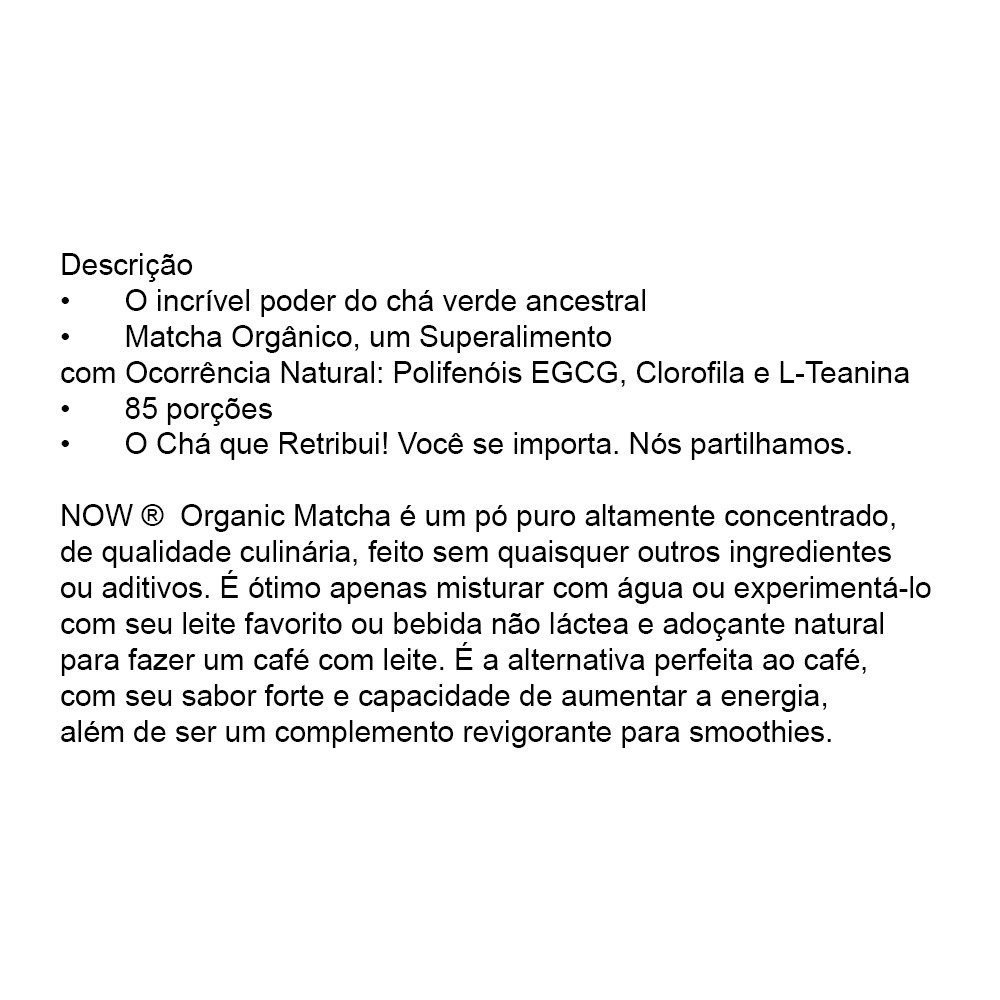 Chá Verde Matcha em Pó Now Foods 85g Orgânico Produto Importado 1. Experiência Autêntica do Chá Verde Matcha: O Chá Verde Matcha em Pó da Now Foods oferece uma experiência autêntica e enriquecedora. Ideal para os amantes de chá, este produto proporciona o verdadeiro sabor do matcha, conhecido por seu perfil único de sabor. 2. Embalagem Conveniente e Sustentável: Este chá verde matcha é apresentado em um pacote de 85g, perfeitamente dimensionado para uso regular e fácil de armazenar. A embalagem é desenhada para manter a frescura e qualidade do produto, garantindo que cada xícara seja tão boa quanto a primeira. 3. Qualidade Importada com Disponibilidade Imediata: Importado para garantir a mais alta qualidade, este chá verde matcha orgânico está disponível para pronta entrega. Você pode começar a desfrutar de suas xícaras de matcha sem longas esperas. 4. Fácil Incorporação na Rotina Diária: O Chá Verde Matcha da Now Foods pode ser facilmente integrado à sua rotina diária. Perfeito para uma xícara revigorante pela manhã ou um momento relaxante à tarde, sua preparação é simples e rápida. 5. Composição Orgânica e Pura: Este chá verde matcha é 100% orgânico, garantindo que você desfrute de um produto puro e de alta qualidade. Sem aditivos ou conservantes, oferece um sabor natural e autêntico que só um verdadeiro matcha pode proporcionar. Validade longa