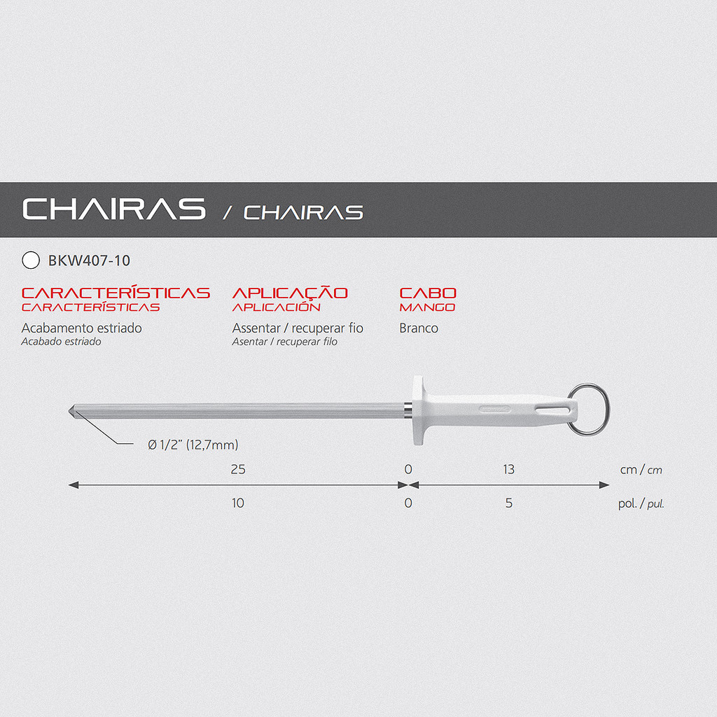 Chaira Estriada 10” 25cm Cabo Branco Starrett KBW407-10 Descrição: - Para assegurar o alto índice de durabilidade da sua linha de facas profissionais, a Starrett também possui uma linha de chairas; - São modelos desenvolvidos especialmente para garantir a qualidade dos produtos e a segurança dos usuários durante o processo de chairamento das facas profissionais. Características: - Haste estriada; - Aço alto carbono; - Recobrimento de cromo duro; - Imantada (retém o limalha da faca); - Possui argola nos cabos. Vantagens: - Facilidade de higienização; - Alta durabilidade; - Recupera e assenta o fio; - Maior resistência a oxidações. Dicas: - Recomendável que a chaira seja escolhida de acordo com o tamanho da faca, opte por aquela que possui +5cm (2”) a mais do que a faca a ser chairada, nesse caso essa chaira é ideal para facas de 20cm ou 8”; - O processo de chairamento sempre deve ser feito a seco. Dados Técnicos: - Marca: Starrett; - Modelo: KBW407-10; - Polegadas: 10”; - Material: Aço Carbono; - Diâmetro: 1/2" (12,7mm). Componentes Inclusos: -01 Chaira Estriada 10” 25cm Cabo Branco Starrett KBW407-10.