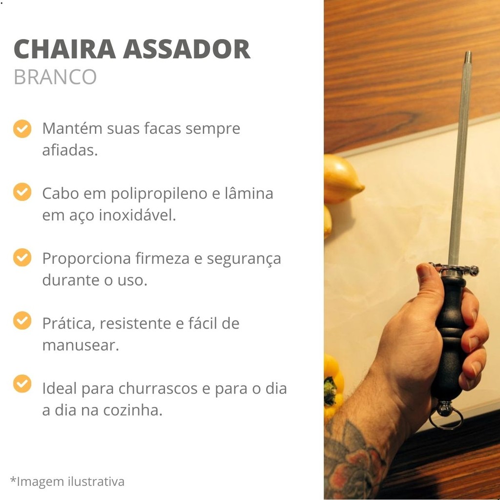 Chaira Assador – Cabo Branco em Polipropileno Mantenha suas facas sempre afiadas e prontas para o preparo de carnes e pratos deliciosos com a Chaira Mor. Ideal para churrascos e para o dia a dia na cozinha, este afiador combina praticidade, segurança e durabilidade. Destaques do Produto: Mantém suas facas afiadas por muito mais tempo. Cabo em polipropileno resistente e higiênico. Lâmina em aço inoxidável, proporcionando firmeza e segurança no uso. Fácil de manusear, prática e durável. Perfeita para churrascos e uso diário na cozinha. Especificações Técnicas: Material: Polipropileno (cabo) e aço inoxidável (lâmina) Cor: Branco Altura: 2,5 cm Comprimento: 29 cm Largura: 6,5 cm Peso: 143 g Observação: Os objetos que ambientam as imagens não acompanham o produto.
