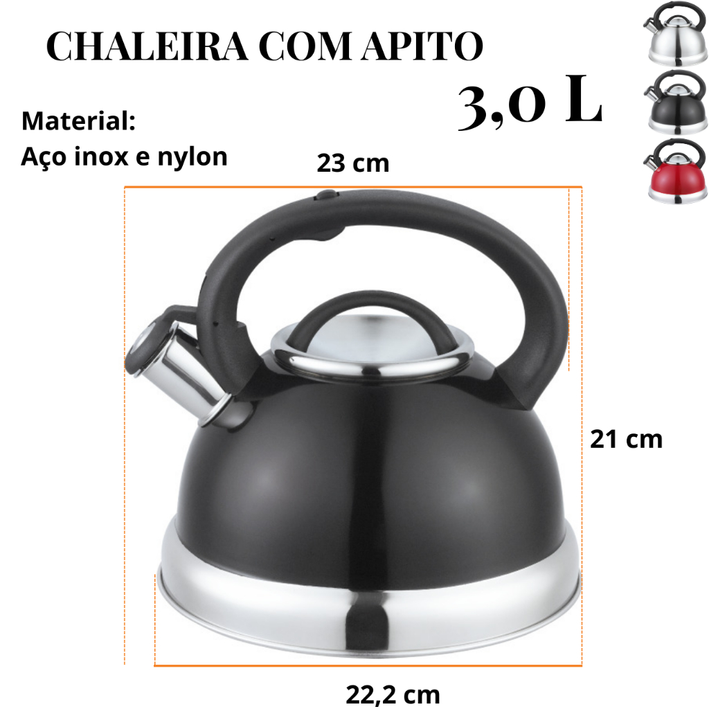LEIA COM ATENÇÃO 1 x Chaleira com Apito Inox 3 L Cores disponíveis: Cromada, Preta ou vermelha Com design ergonômico e material com acabamento em aço inoxidável, as chaleiras com apíto combinam beleza e funcionalidade para sua cozinha. Possui sistema com apito que serve como um aviso sonoro quando a água atinge o ponto de fervura, evitando desperdício e queimaduras. Garanta a sua e eleve sua experiência na cozinha! Características: - Possui tampa com sistema de encaixe e travamento - Possui Alavanca (botão) de acionamento que abre e fecha a tampa do bico - Medidas: Altura: 21 cm x Largura: 23 cm x Profundidade: 22,2cm - Material: Aço inox e nylon - Capacidade:3,0 L